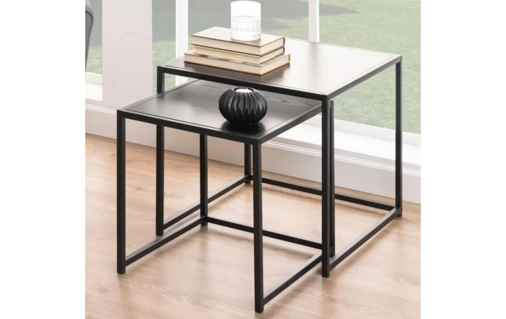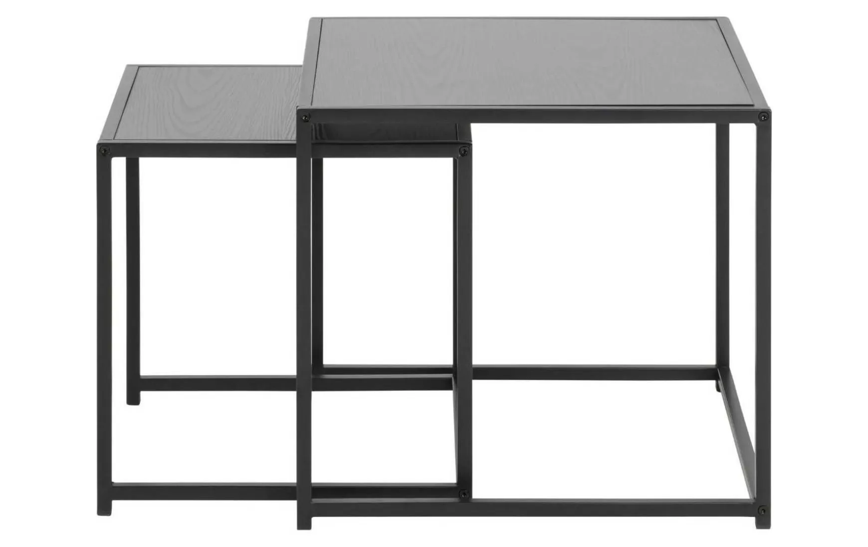 Dieser Satz Couchtische besteht aus einem schwarz pulverbeschichteten Metallgestell und einer schwarzen Laminatplatte. Die Tische repräsentieren den Industriestil und passen perfekt in industrielle Innenräume. Der größere Tisch misst 45 x 50 x 50 cm, der kleinere 40 x 40 x 40 cm.