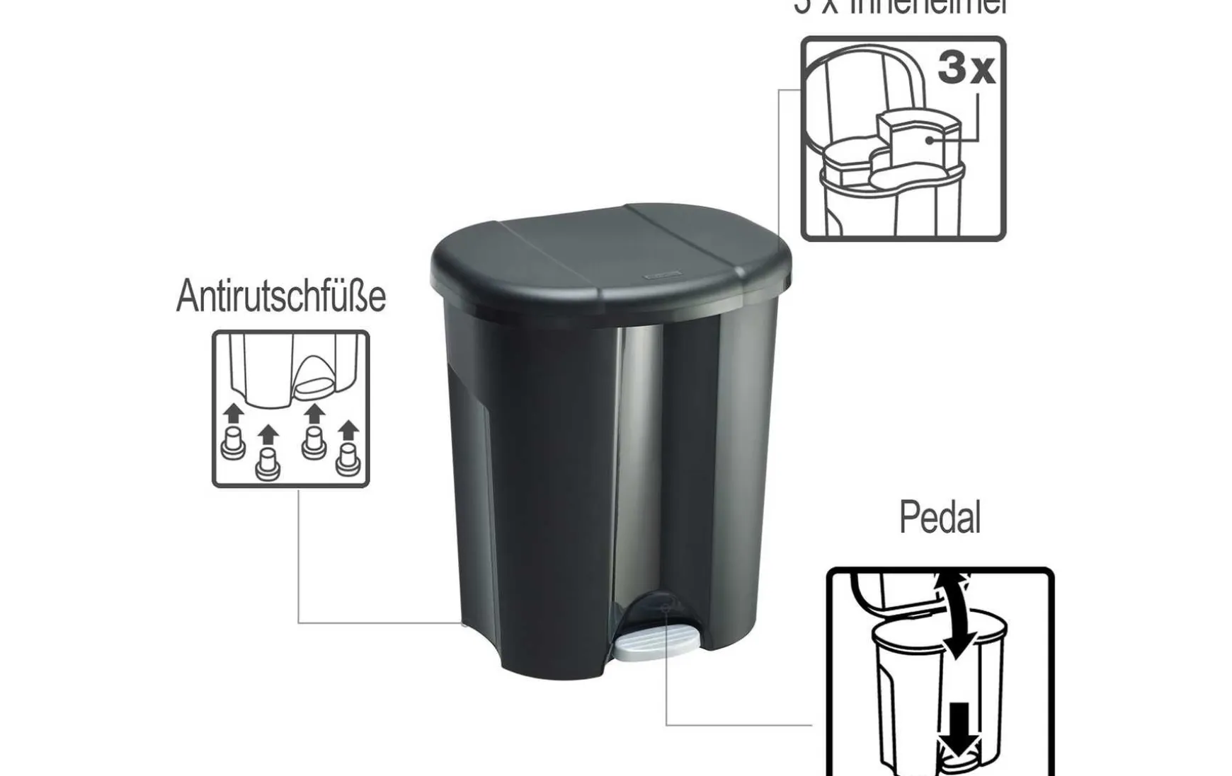 Der Deckel des Treteimers lässt sich per Fußpedal geräuschlos öffnen und schließen. Vier Gummifüße sorgen für festen Stand und Kippsicherheit.