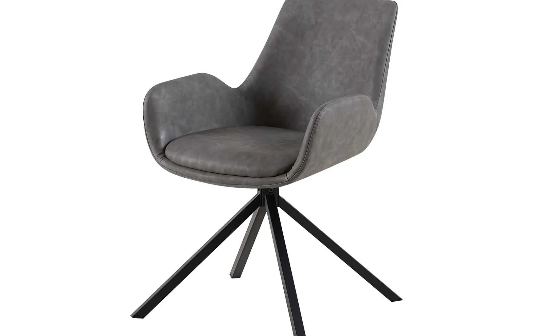 Der Armlehnstuhl im modernen Stil überzeugt durch sein elegantes Design und hohen Sitzkomfort. Der PU-Bezug in grauer Vintage-Optik verleiht dem Stuhl eine stilvolle Ausstrahlung und ist zugleich pflegeleicht. Das schwarze, pulverbeschichtete Metallgestell sorgt für Stabilität und einen sicheren Stand. Dank der Drehfunktion bietet der Armlehnstuhl zusätzliche Bewegungsfreiheit und eignet sich ideal für Essbereich, Arbeitszimmer oder Wohnraum. Der Stuhl wird vormontiert geliefert und ist sofort einsatzbereit.