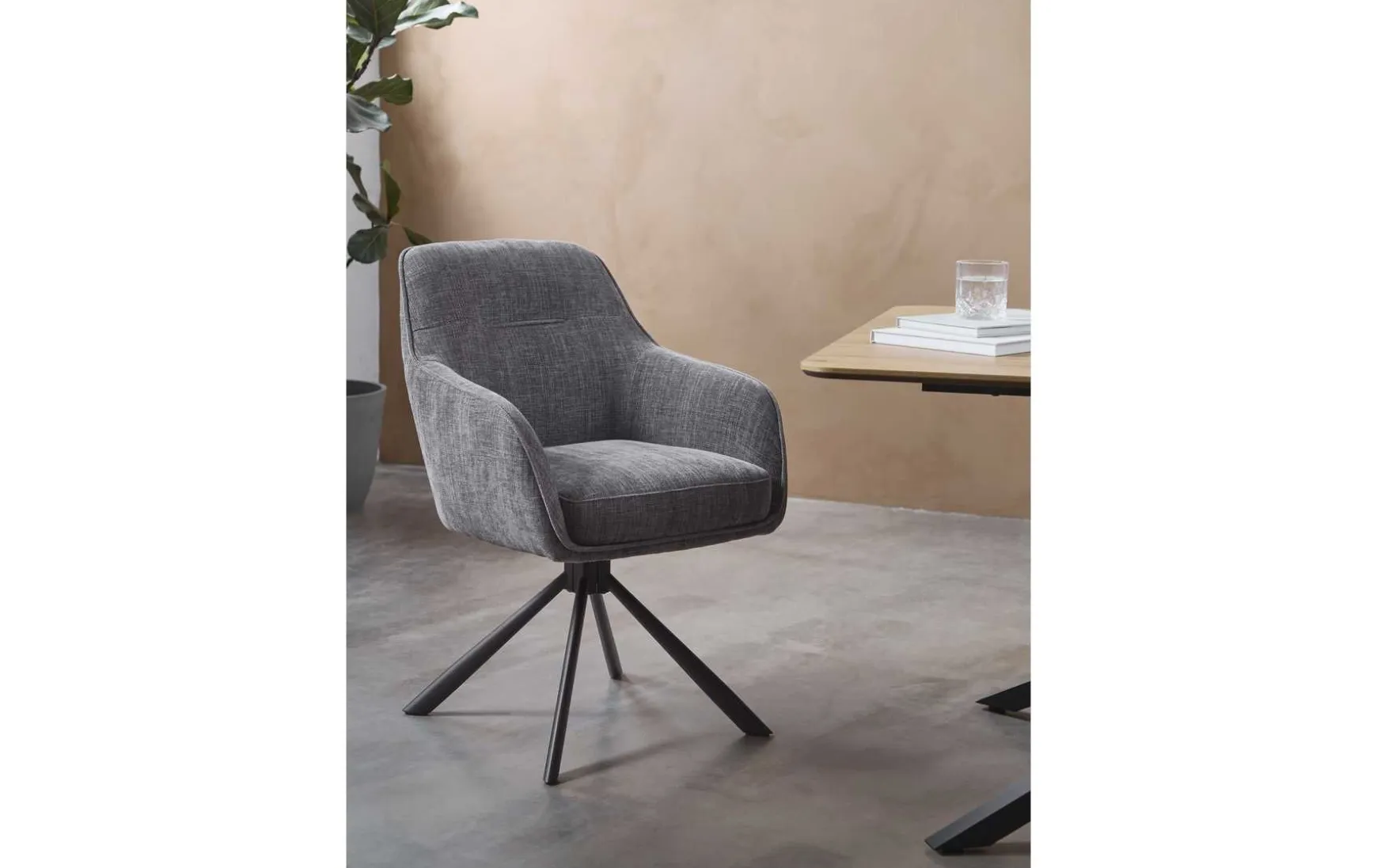 Dieser elegante Armlehnstuhl verbindet zeitloses Design mit spürbarem Komfort und wird schnell zum stilvollen Mittelpunkt in Ess- oder Wohnbereich. Der fein strukturierte Stoff in zeitlosen Graphit-Ton wirkt warm, modern und einladend zugleich. Seine sanft geschwungene Form umschließt den Körper angenehm und sorgt für ein entspanntes Sitzgefühl – perfekt für lange Abende am Tisch oder ruhige Momente zwischendurch.