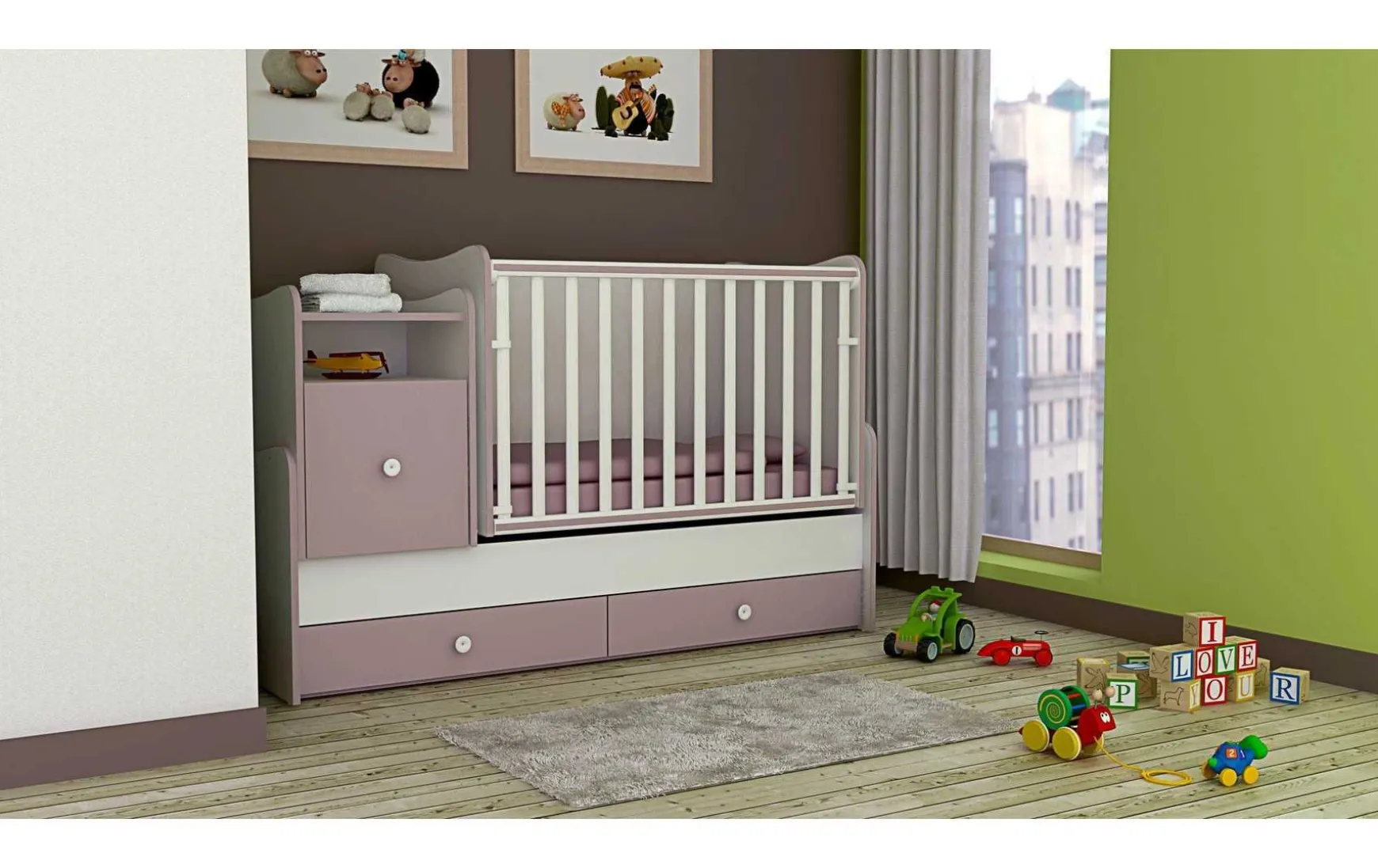 - Babybett mit Wiegefunktion, integrierter Wickelkommode & Laden