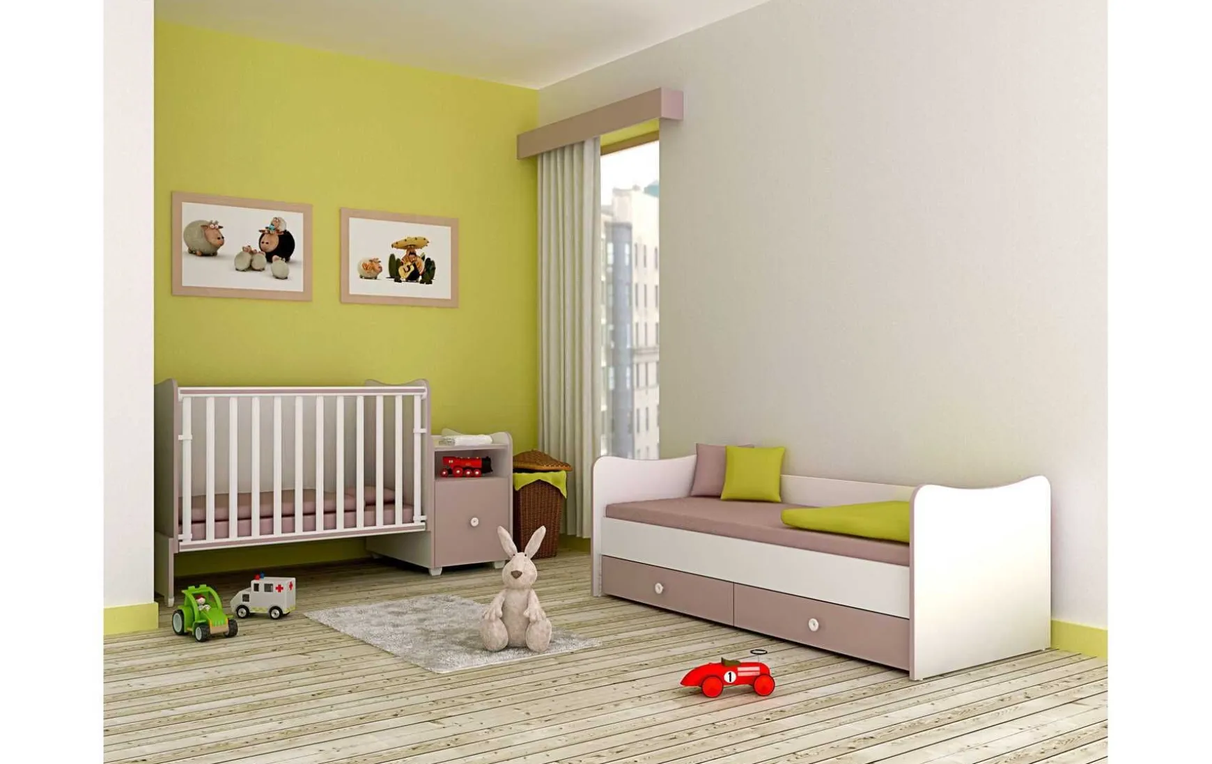 Dieses vielseitige Babybett mit integrierter Wiegefunktion ist eine durchdachte Komplettlösung für das Babyzimmer. Neben dem Babybett sind eine Wickelkommode, praktische Schubladen sowie ein Bettkasten bereits inklusive und sorgen für maximalen Komfort und Stauraum auf kleinem Raum. Der höhenverstellbare Lattenrost unterstützt ein rückenschonendes Handling im Alltag. Besonders praktisch: Dank der mitgelieferten Umbauseiten lässt sich das Bett später problemlos in ein Junior- bzw. Kinderbett umwandeln. Das moderne Design in Light Oak und Weiß fügt sich harmonisch in unterschiedliche Einrichtungsstile ein und kann ideal mit weiteren Möbeln kombiniert werden.