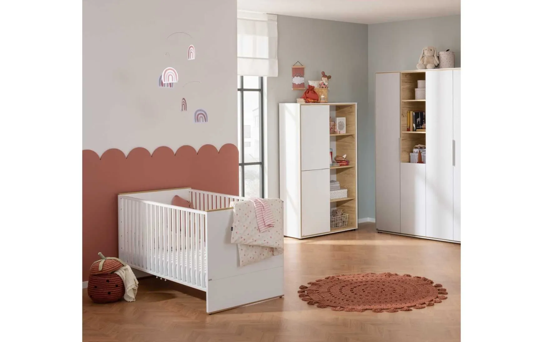 Dieses Babybett bietet mit seinen klaren Linien und der warmen Farbkombination von Kreideweiß und Eiche-Montana-Nachbildung Raum für schöne Träume. Das helle, freundliche Design und die eleganten Gitterseiten lassen Licht und Luft hindurch. Das mitwachsende Kinderbett lässt sich dank des 4-fach verstellbaren AIRWELL Comfort-Federleistenrost auf jede Wachstumsphase Ihres Kindes einstellen und sorgt gemeinsam mit den Bettsprossen für maximale Sicherheit im Babyzimmer. Die Liegefläche hat eine Größe von 70×140 cm.