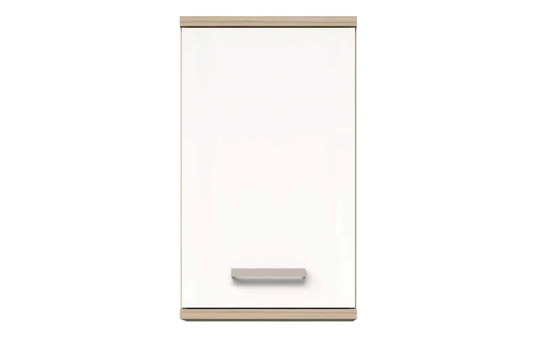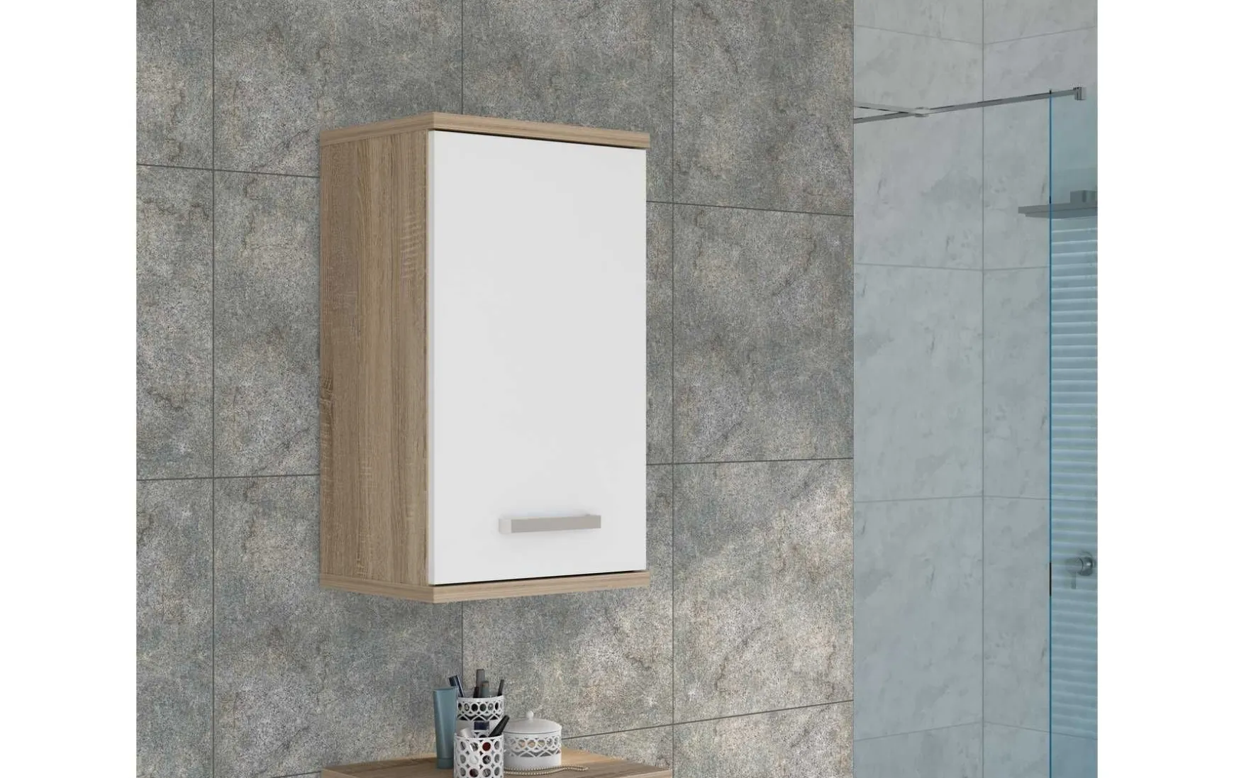 Dieser Badezimmer-Hängeschrank überzeugt durch klare Linien und eine moderne, glänzende Front in Weiß. Der Korpus in Eiche Sonoma Dekor verleiht dem Schrank eine natürliche Note. Die Edelstahlgriffe sind hochwertig verarbeitet und können wahlweise links oder rechts montiert werden. Hinter der Tür bietet ein Einlegeboden praktischen Stauraum für Badutensilien. Der hängende Badschrank ist platzsparend, pflegeleicht und ideal für moderne Badezimmer. Lieferung erfolgt zerlegt, Dekoration ist nicht im Lieferumfang enthalten.