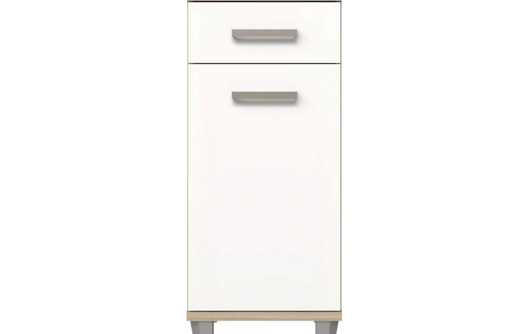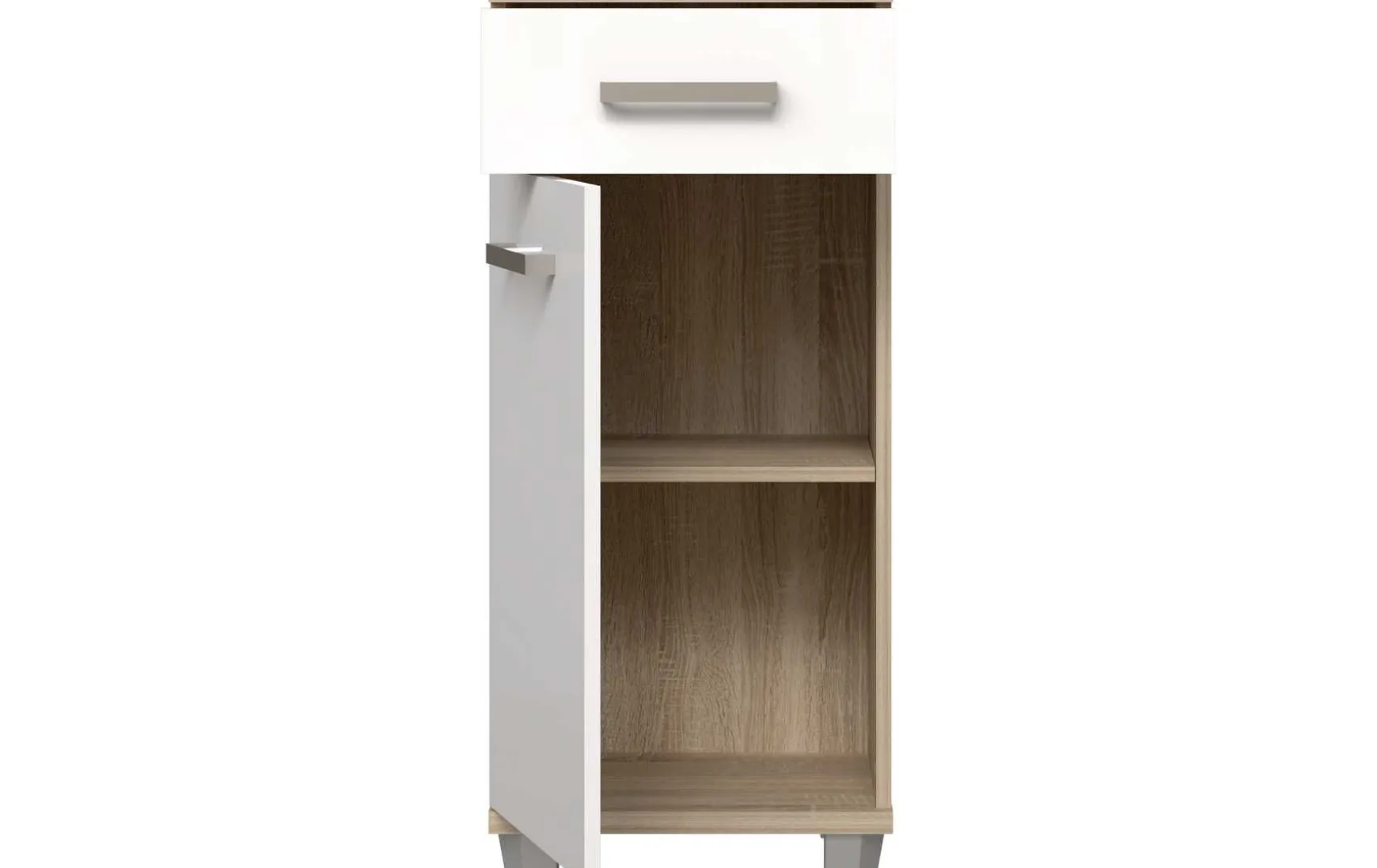 Die Badezimmer-Kommode im charmanten Landhausstil verbindet zeitloses Design mit praktischer Funktionalität. Der Korpus in Sonoma Eiche harmoniert perfekt mit der weiß glänzenden Front und den Griffen in Metall-Optik. Eine Schublade und eine Tür bieten ausreichend Stauraum für Handtücher und Badutensilien. Die pflegeleichte, melaminharzbeschichtete Oberfläche lässt sich einfach trocken abwischen. Stehend konzipiert und ideal für kleinere Bäder geeignet. Lieferung erfolgt zerlegt, Dekoration ist nicht im Lieferumfang enthalten.