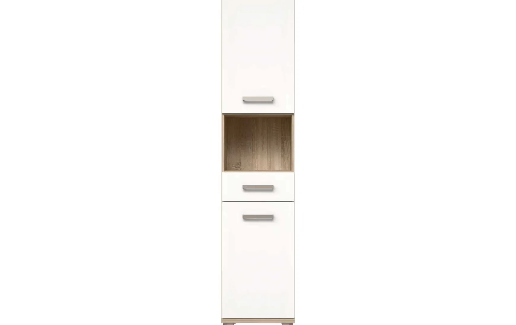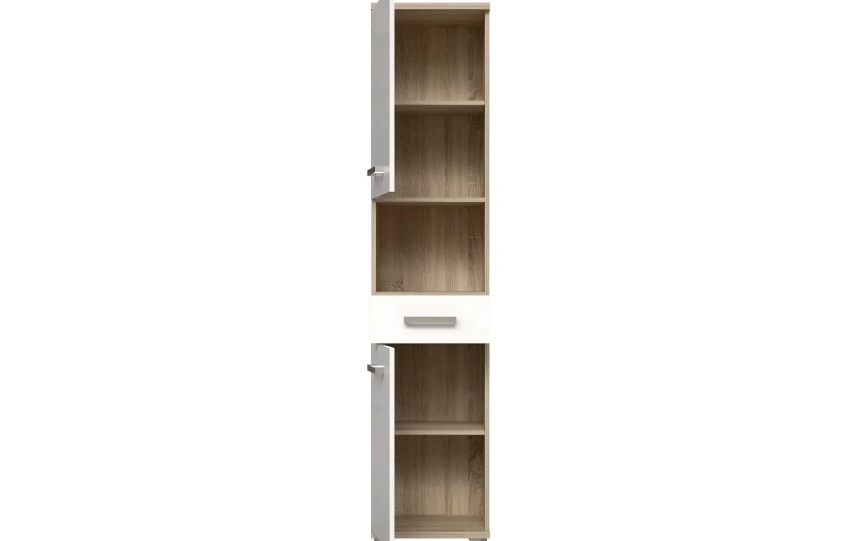 Der freistehende Badezimmer-Seitenschrank im skandinavischen Stil überzeugt durch klare Linien und hochwertige Details. Die Kombination aus Korpus in Eiche Sonoma und weiß hochglänzender Front verleiht dem Schrank eine helle, moderne Optik. Schubkästen auf stabilen Metallleisten, Metallscharniere sowie Edelstahlgriffe sorgen für langlebige Qualität und komfortable Nutzung. Mit zwei Türen, einer Schublade, einem offenen Fach und vier Einlegeböden bietet der Schrank großzügigen Stauraum auf schmaler Stellfläche. Pflegeleicht und ideal für moderne Badezimmer. Lieferung erfolgt zerlegt, Dekoration ist nicht im Lieferumfang enthalten.