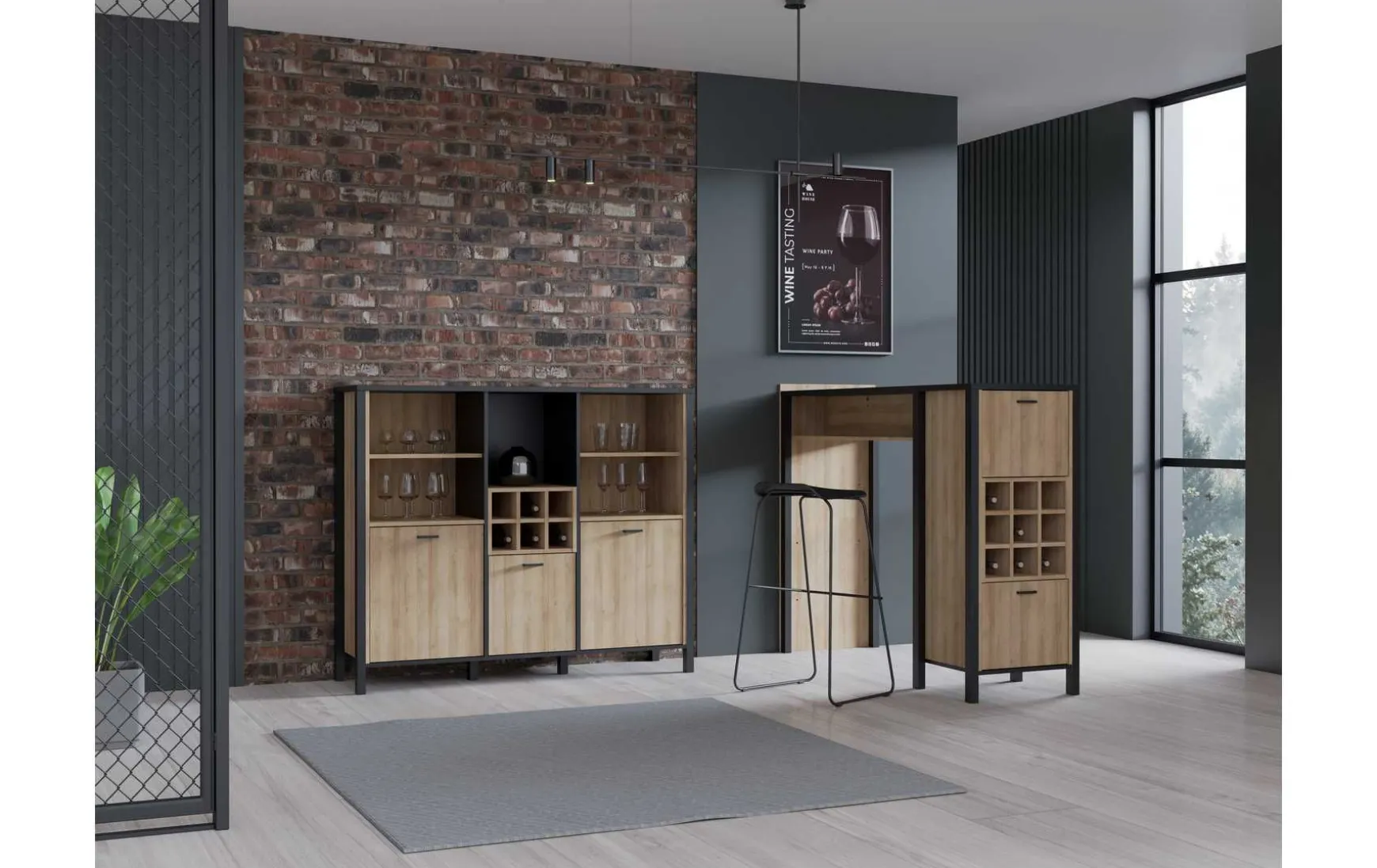 Dieser moderne Barschrank im Riviera-Eiche-Dekor vereint stilvolles Design mit praktischer Funktionalität. Der schwarze Metallrahmen und das filigrane Gestell verleihen dem Möbel einen zeitgemäßen Industrial-Look, während die warmen Holztöne für eine gemütliche Atmosphäre sorgen. Hinter den drei Türen bietet der Barschrank ausreichend Platz für Gläser, Flaschen und Barzubehör und wird so zum eleganten Mittelpunkt in Wohn- oder Essbereich.