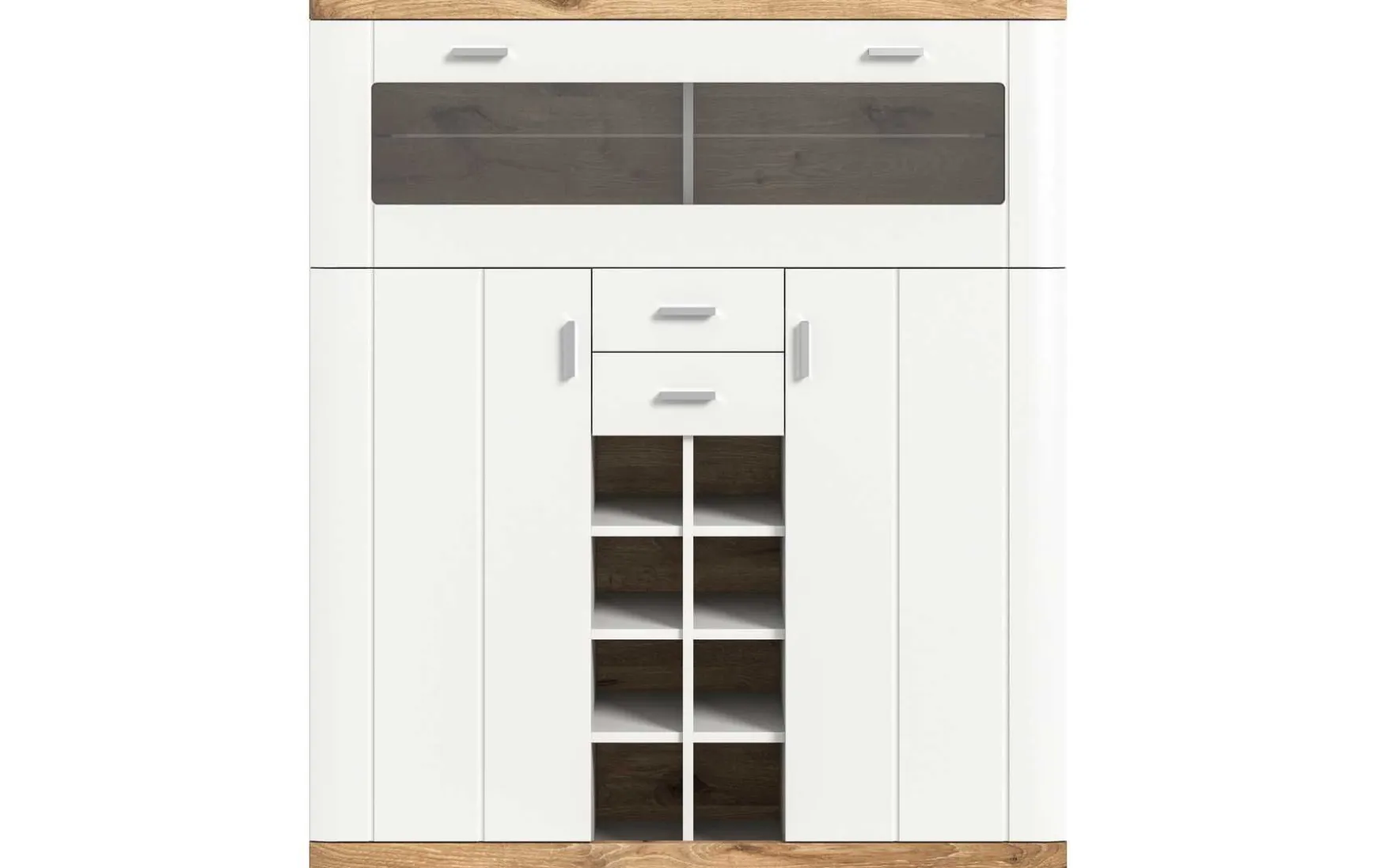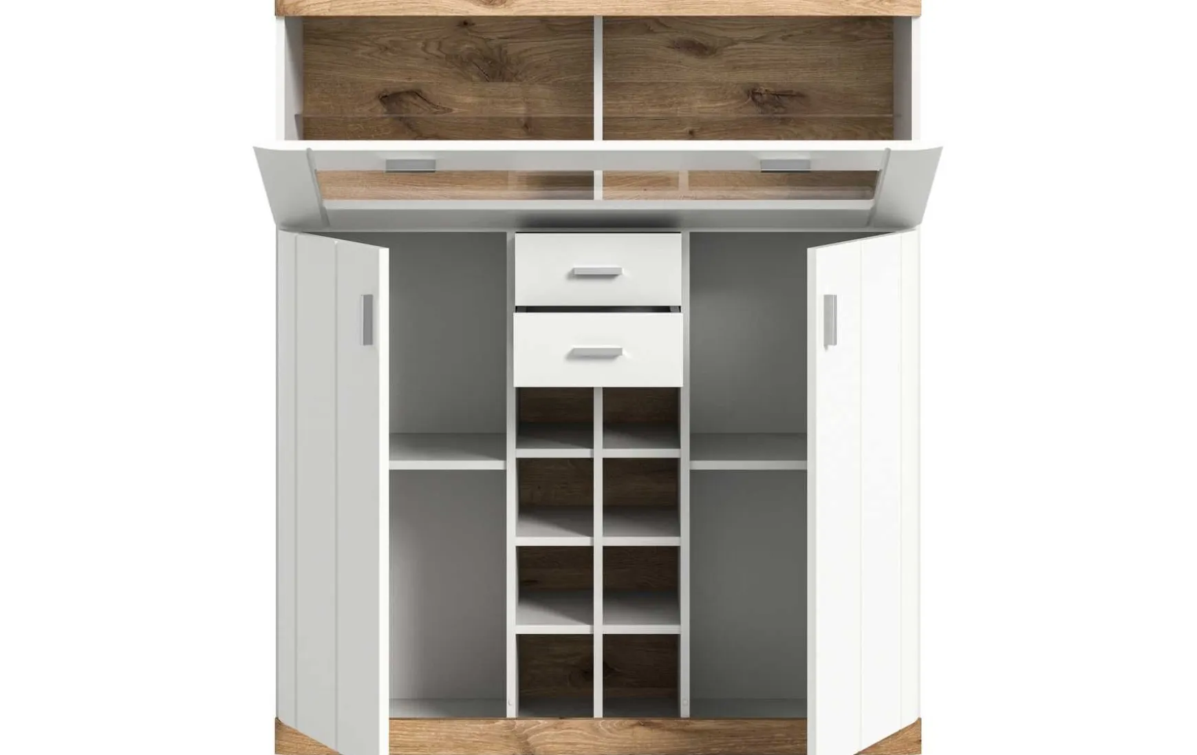 Der Barschrank im Landhausstil vereint großzügigen Stauraum mit einem zeitlos eleganten Design. Die weiß matte Oberfläche in Kombination mit der dekorativen Absetzung in Nox Eiche Dekor sorgt für eine warme und wohnliche Optik. Ausgestattet mit zwei Drehtüren, zwei Schubkästen, acht Fächern und drei Böden bietet der Barschrank viel Platz für Gläser, Flaschen und Barzubehör. Mit seinen Maßen von ca. 117 × 140 × 37,5 cm eignet er sich ideal für Wohn- oder Essbereiche. Die pflegeleichten, glatten Oberflächen lassen sich einfach feucht abwischen. Der Barschrank wird vormontiert geliefert und ist zur Selbstabholung in der Filiale vorgesehen. Eine LED-Beleuchtung ist nicht im Lieferumfang enthalten.