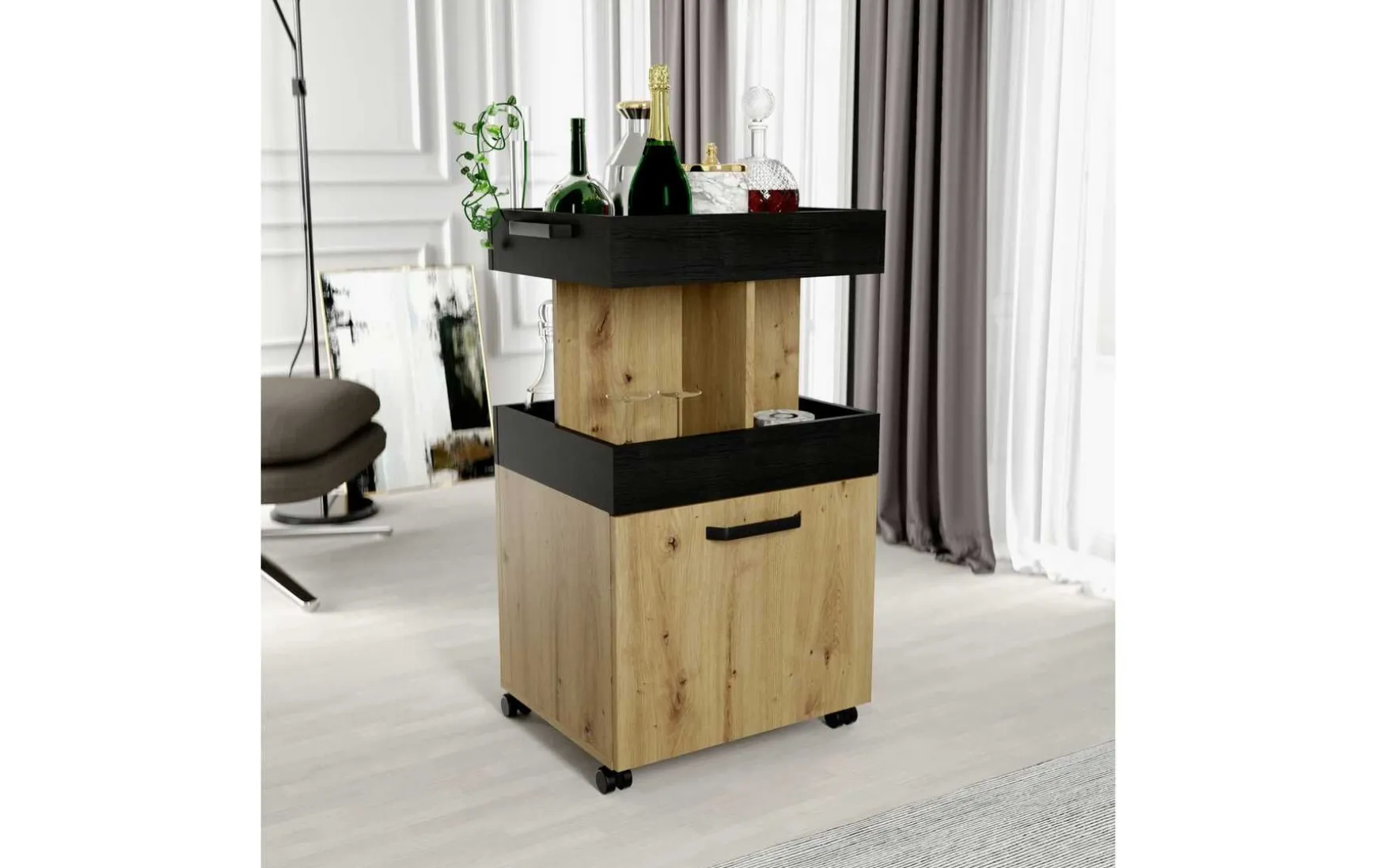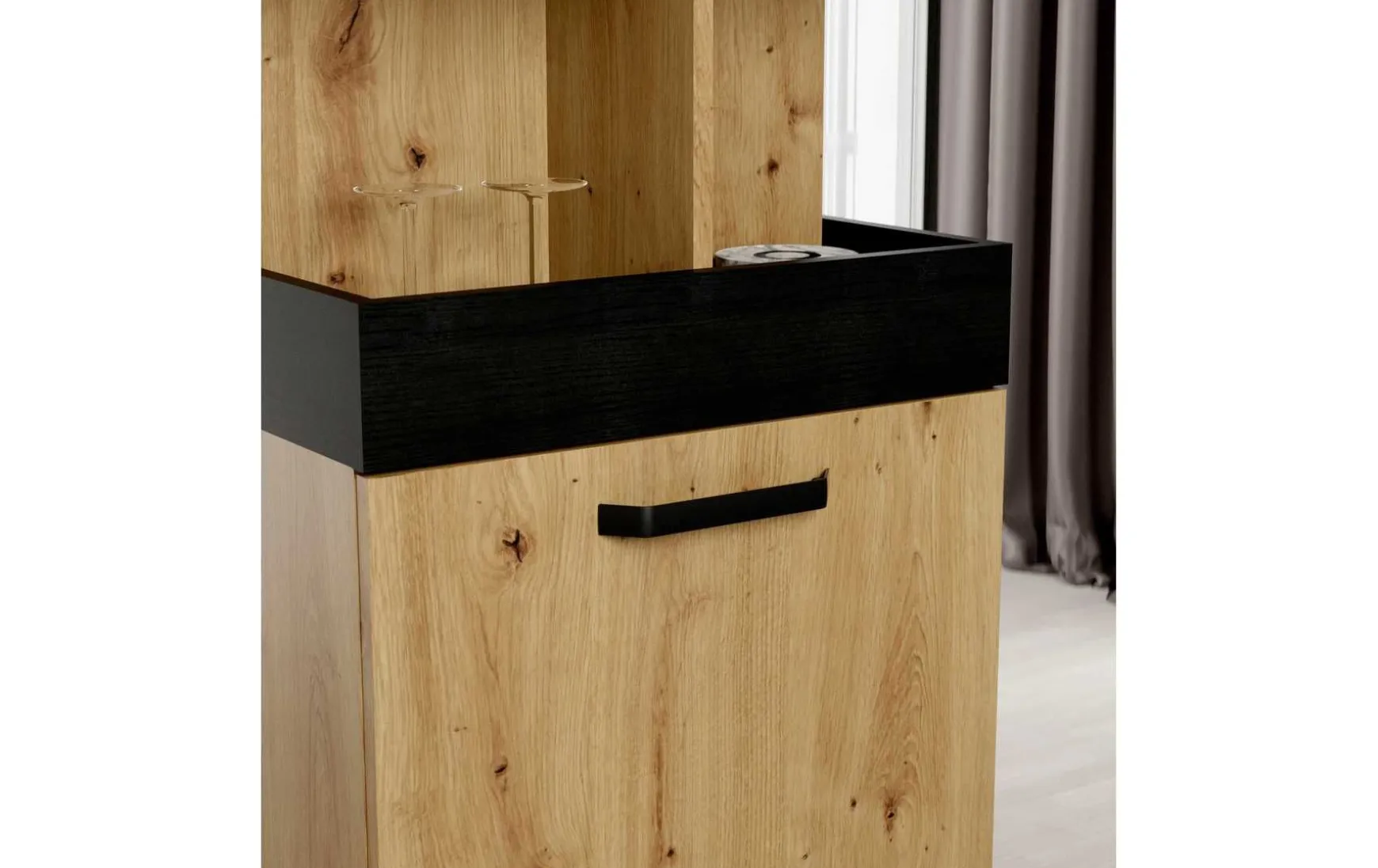 Dieser hochwertig verarbeitete Barschrank im modernen Design zieht sämtliche Blicke auf sich. Er begeistert durch eine attraktive Holzoptik mit Maserung und ist mit kontraststarken Absetzungen gestaltet. Schöne Bügelgriffe ergänzen das gelungene Erscheinungsbild. Damit du die Minibar problemlos und schnell verschieben kannst, verfügt sie über nützliche Rollen. Ausgestattet mit mehreren Fächern, bietet sie genügend Platz für Flaschen und Gläser. Hergestellt wird das Barmöbel aus Holzwerkstoff mit einer pflegeleichten Oberfläche. Der Türanschlag ist frei wählbar.