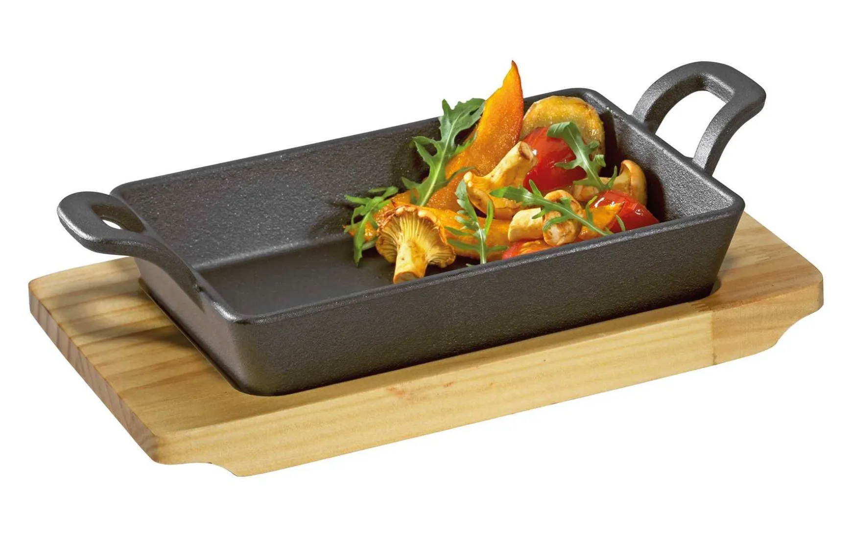 Die Grill-/Servierpfanne ist ideal für das Zubereiten kleiner Speisen und Beilagen auf dem Grill und im Backofen. Das wärmespeichernde Material Gusseisen sorgt dafür, dass die Speisen lange heiß bleiben. Dank des Holzbrettes kann die Pfanne auch am Tisch stilvoll serviert werden, dabei wird sie in der Mulde sicher gehalten. Geeignet für Grill, Backofen und alle Herdarten. Die Pfännchen sind aus Gusseisen, die Untersetzer aus Pinienholz