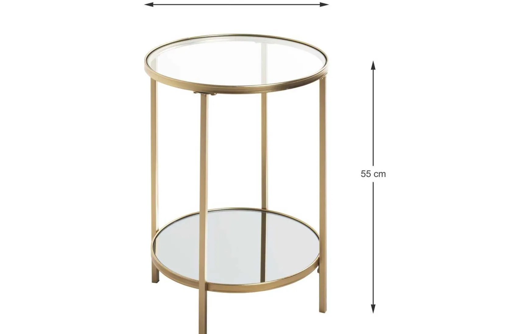 Der runde Beistelltisch im modernen Design überzeugt durch seine elegante Kombination aus Metallgestell in edler Gold- bzw. Messingoptik und einer Tischplatte aus klarem Sicherheitsglas. Mit einem Durchmesser von ca. 39 cm und einer Höhe von ca. 55 cm eignet er sich ideal als stilvolle Ablage neben Sofa oder Sessel. Die hochwertige Glasplatte verleiht dem Tisch eine leichte, moderne Optik und ist zugleich robust und pflegeleicht. Der Beistelltisch lässt sich mühelos mit einem feuchten Tuch reinigen, ist online reservierbar und wird zerlegt zur Selbstabholung oder Lieferung angeboten.