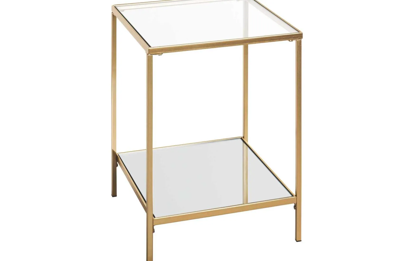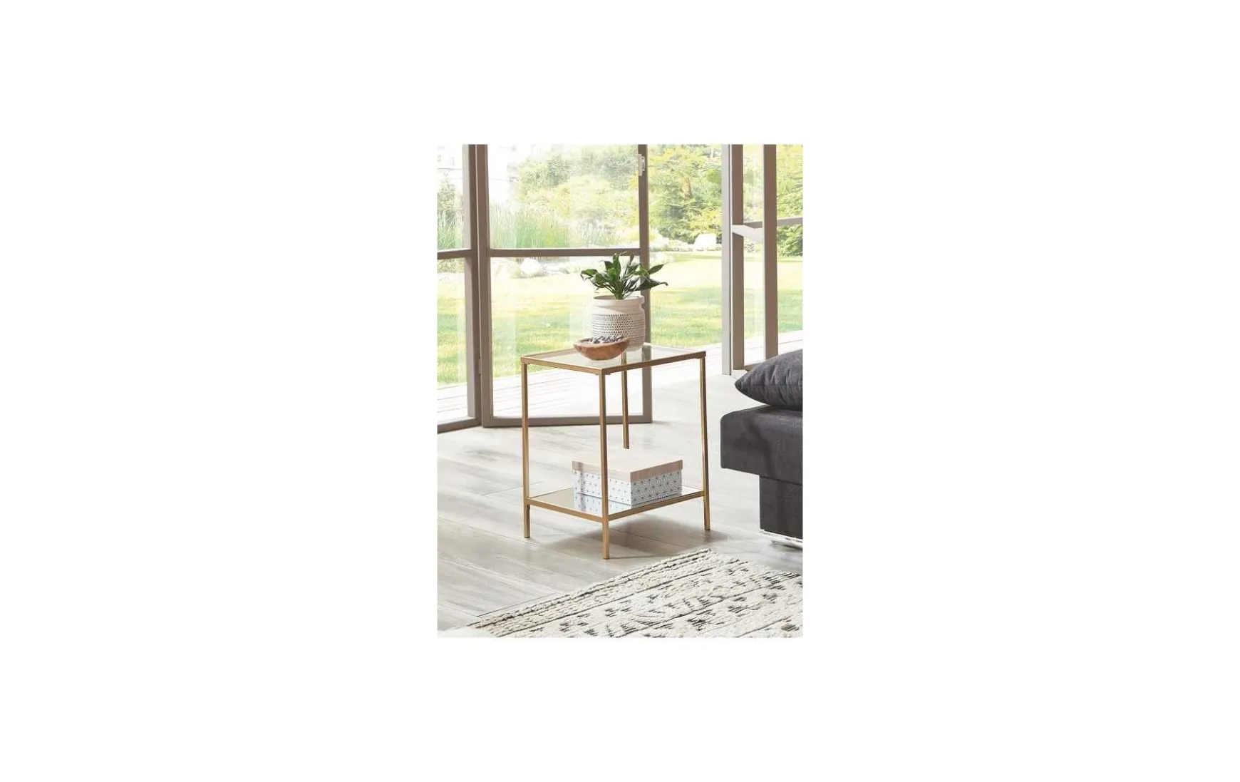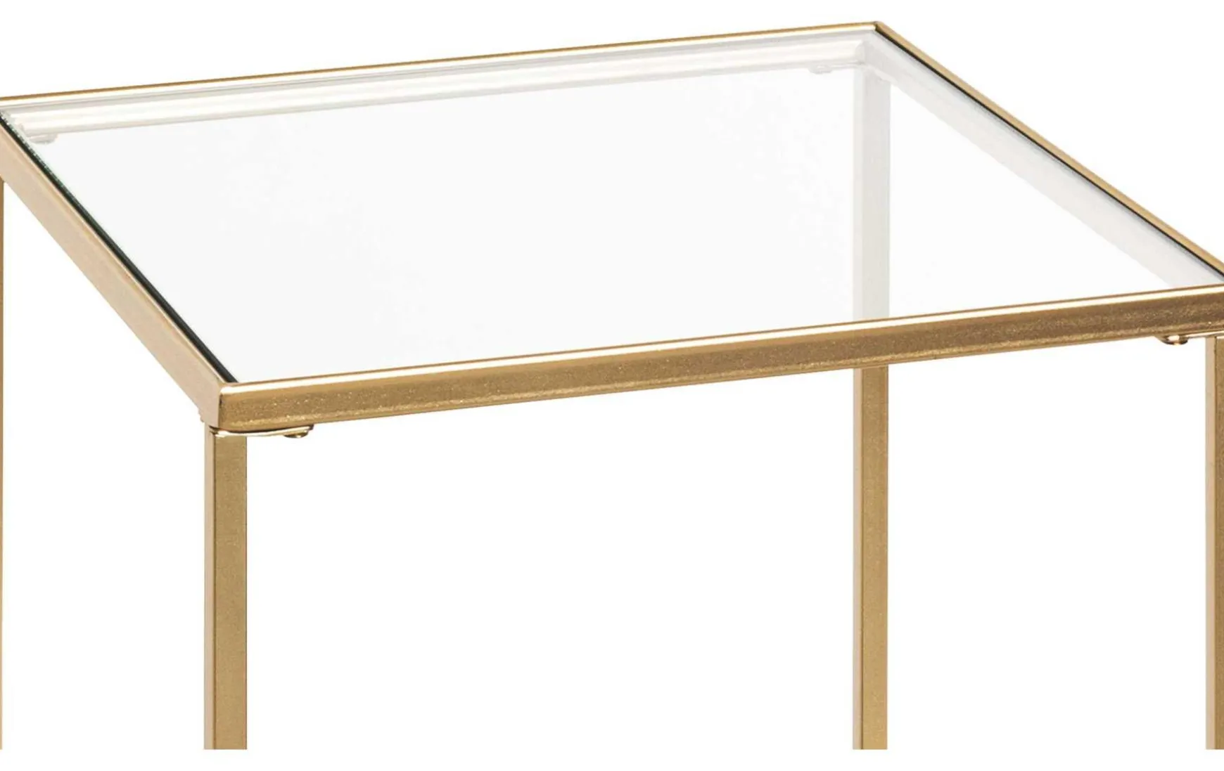 Dieser moderne Beistelltisch überzeugt mit einer quadratischen Tischplatte aus klarem Sicherheitsglas und einem eleganten Gestell in Messingfarben. Mit kompakten Maßen von ca. 39 × 39 × 55 cm eignet er sich ideal als stilvolle Ablage neben Sofa oder Sessel. Dank der pflegeleichten Materialien aus Metall und Glas lässt sich der Tisch mühelos mit einem feuchten Tuch reinigen und wird zerlegt geliefert.