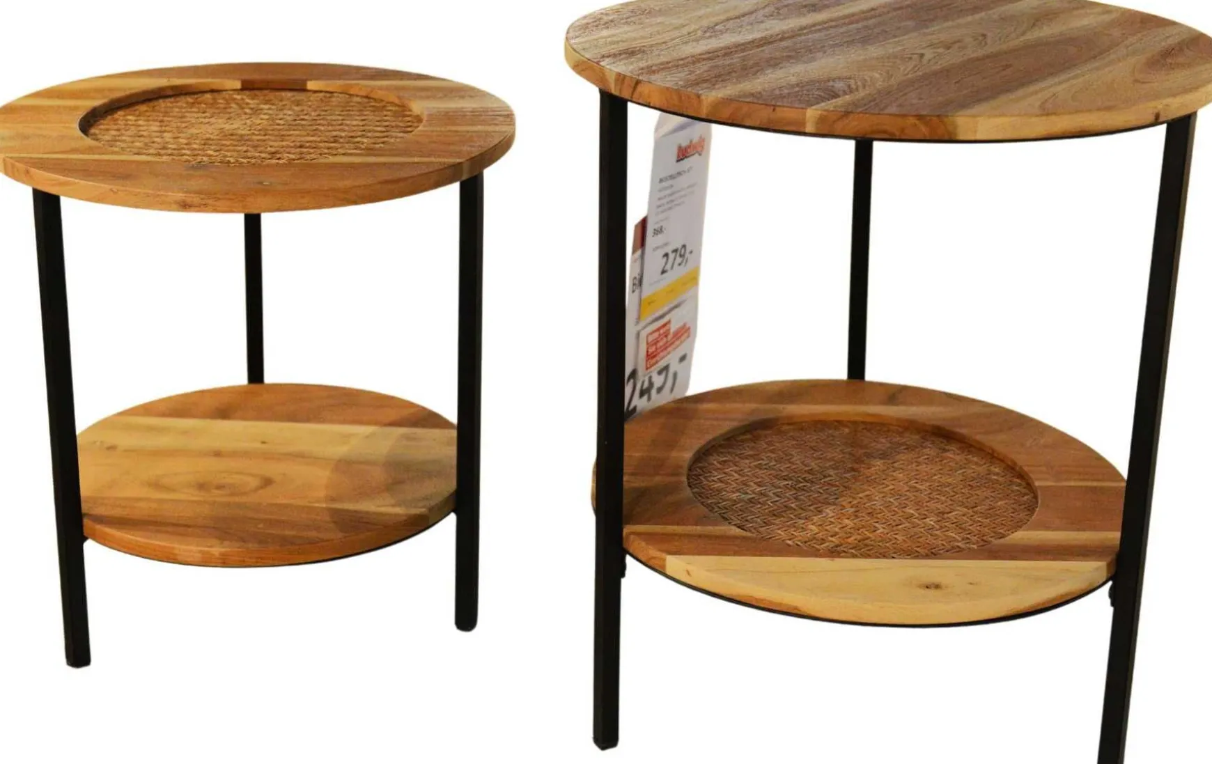 Die beiden unterschiedlich großen Tische mit Maßen von ca. 46 × 51 cm und 39 × 40 cm lassen sich flexibel einsetzen – ob als Beistelltisch neben Sofa oder Sessel, als Ablagefläche oder dekorativ ineinandergeschoben, um Platz zu sparen. Das schlanke, schwarze Metallgestell bildet einen modernen Kontrast zum naturfarbenen Holz und sorgt gleichzeitig für Stabilität.