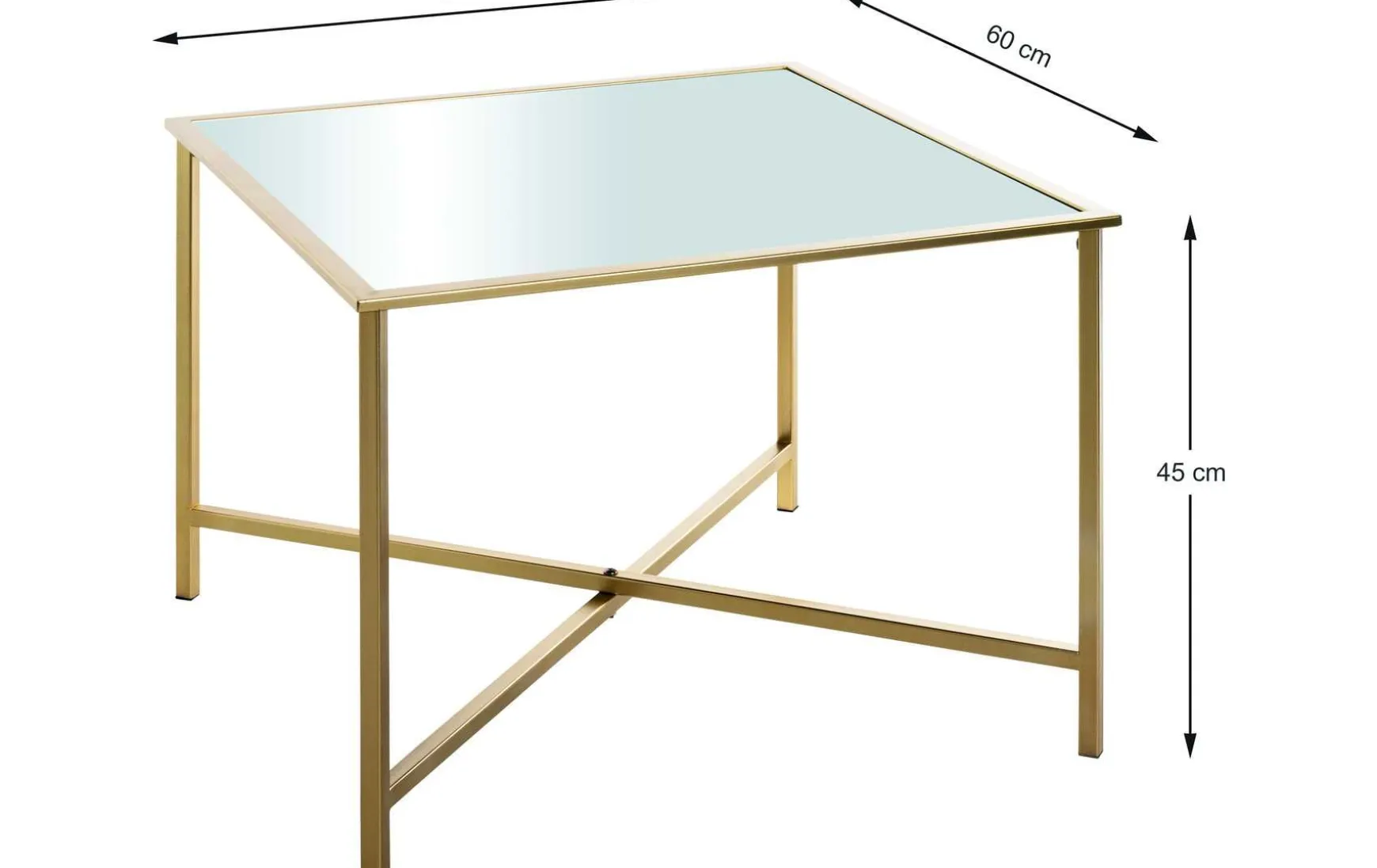 Mit seinen Maßen von 60x60x45cm eignet sich dieser Beistelltisch perfekt, um ihn neben Ihrem Sofa oder Ihrem Bett zu platzieren. Er bietet genügend Platz für Ihre persönlichen Gegenstände und verleiht zugleich Ihrem Raum einen stilvollen Akzent. Der Tisch besteht aus einer rechteckigen Spiegel-Tischplatte, die ihm ein modernes und luxuriöses Aussehen verleiht. Das goldene Metallgestell sorgt für Stabilität und verleiht dem Tisch eine edle Note.