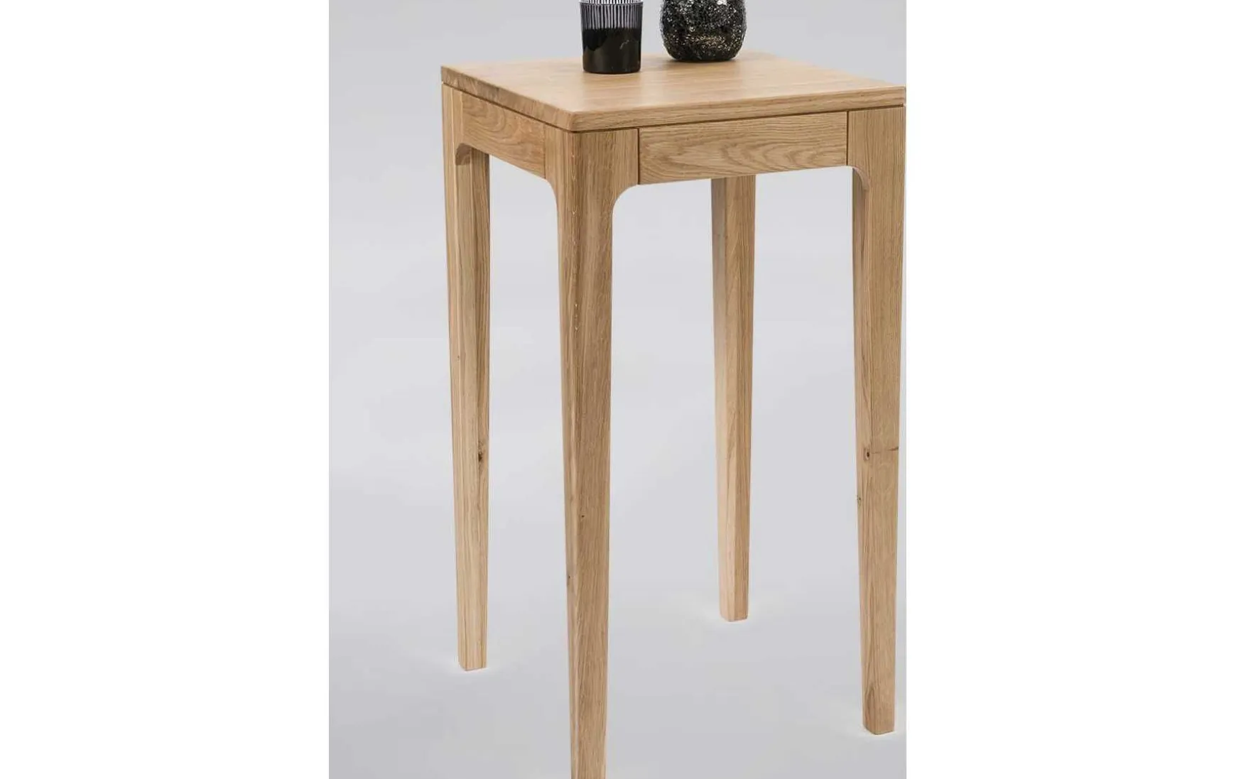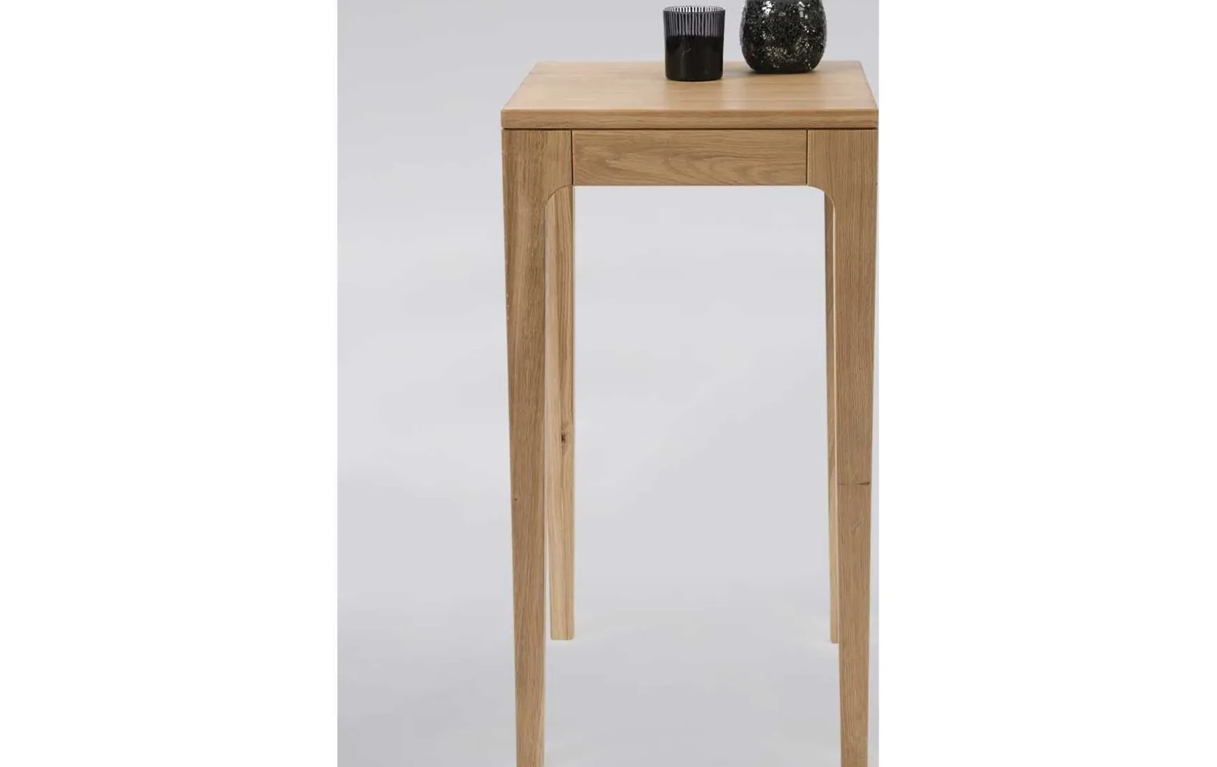 Dieser Beistelltisch aus massiver Wildeiche überzeugt durch seine natürliche Ausstrahlung und hochwertige Verarbeitung. Die geölte Oberfläche betont die schöne Holzmaserung und verleiht dem Tisch einen warmen, zeitlosen Charakter. Dank seines schlanken, hohen Designs eignet er sich ideal als Ablage neben Sofa, Sessel oder Bett.