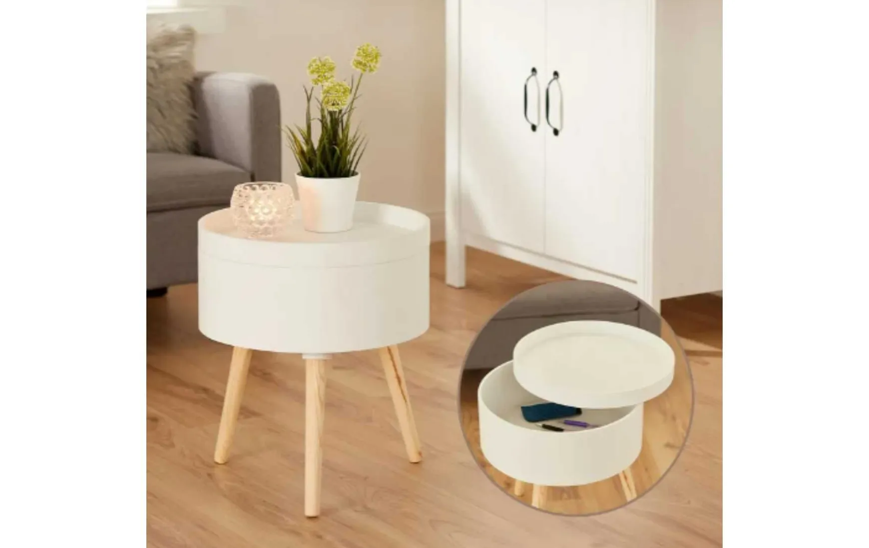 Der runde Beistelltisch im modernen und eleganten Stil, ist durch seine kompakte Höhe passend für jede Zimmergröße. Der abnehmbare Deckel dient mit seinem hohen Rand auch als Tablett. Mit dem Deckel lassen sich Getränke perfekt servieren. Auch vibrierende Smartphones und leicht rollende Stifte werden durch den Rand vorm Runterfallen bewahrt. Der kleine Beistelltisch hat durch das innere Fach viel Stauraum. Nutzen Sie dies für Knabberzeug, Kleidung, unschöne Ladekabel und vieles mehr.