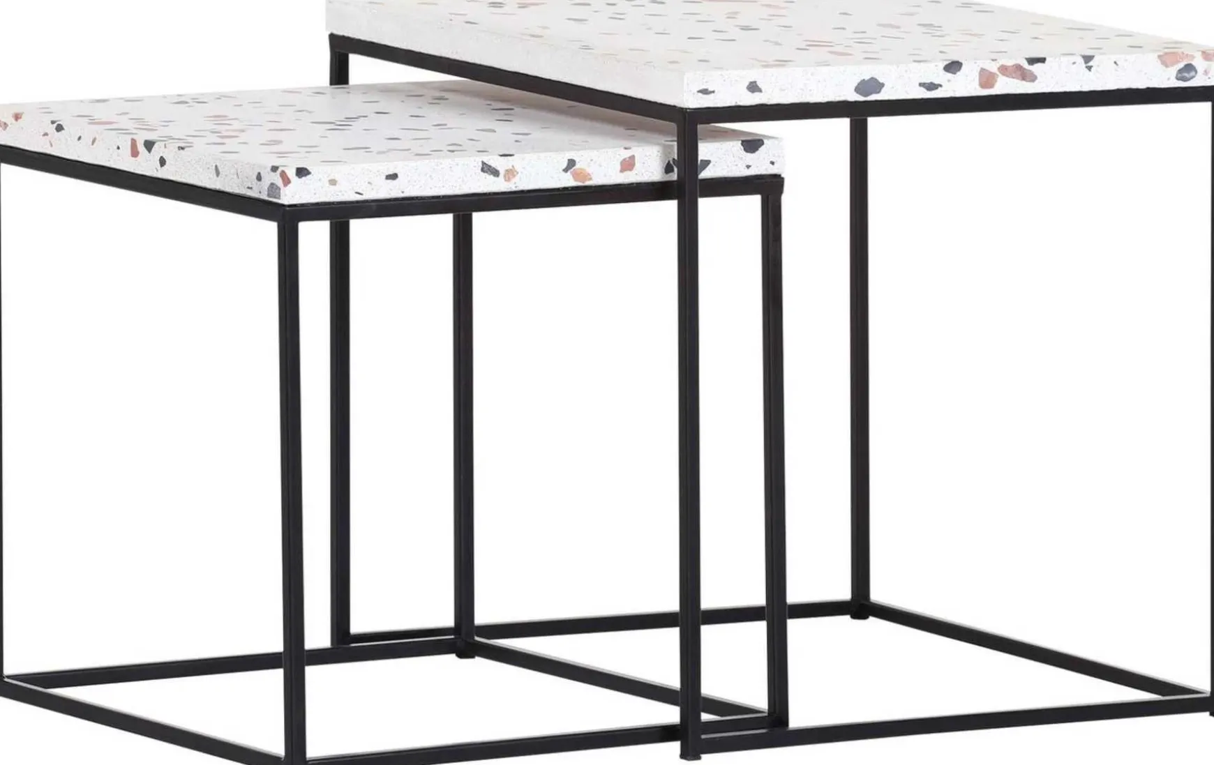 Dieses moderne Beistelltisch-Set besteht aus zwei unterschiedlich großen Tischen und überzeugt durch sein minimalistisches, zeitloses Design. Die Kombination aus weißer Tischfläche und schwarzem Metallgestell sorgt für einen eleganten Kontrast und passt sich vielseitig verschiedenen Einrichtungsstilen an. Dank der zwei Größen lassen sich die Tische flexibel einzeln nutzen oder platzsparend ineinanderschieben.