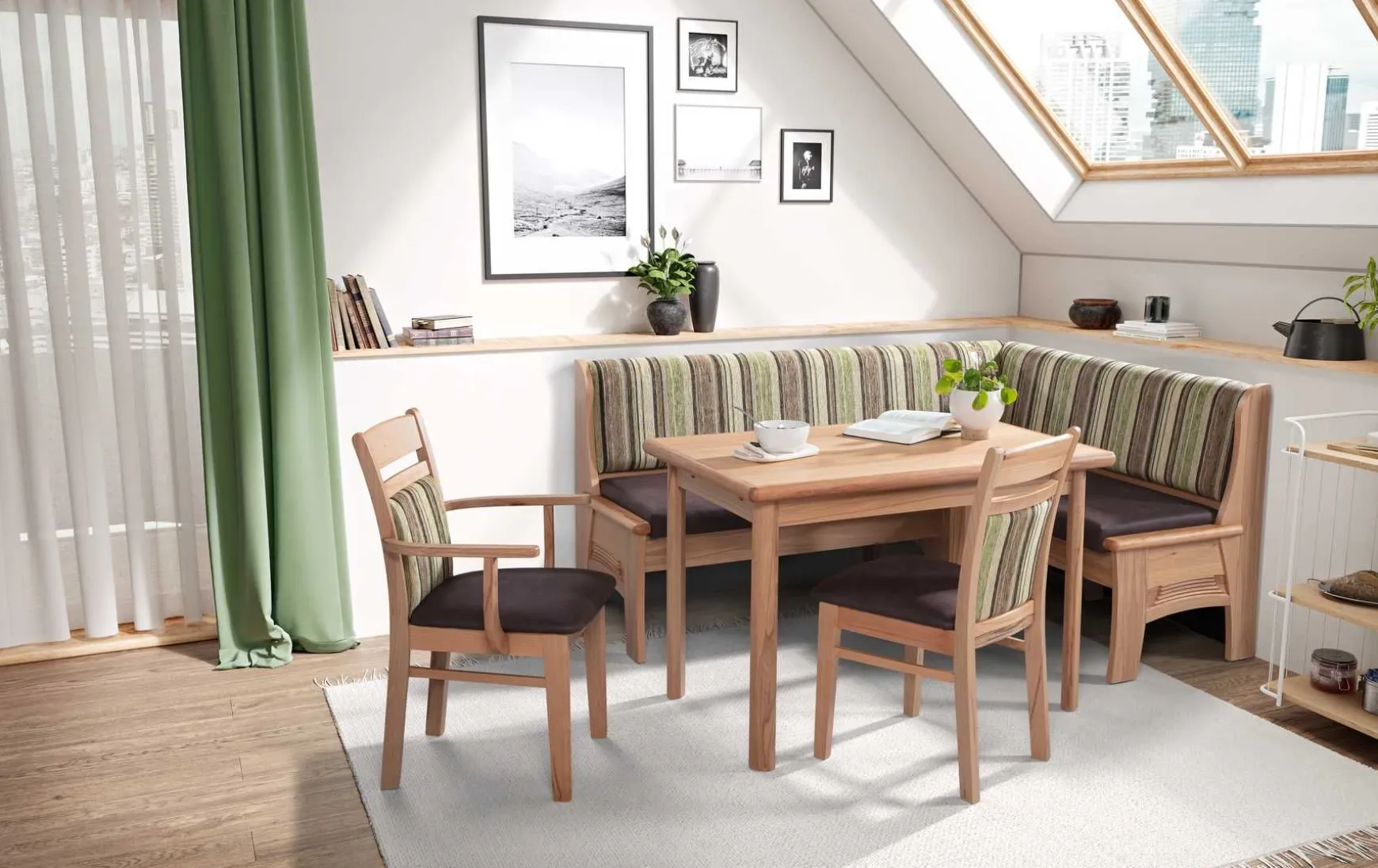 Die bequeme Eckbank mit Truhe aus Kernbuche in natürlicher Lackierung ist ein zeitloses und elegantes Möbelstück für Ihre Küche oder Esszimmer. Der Sitzbezug in Braun und die gestreifte Rückenlehne verleihen der Eckbank einen klassischen und gemütlichen Look, der zu verschiedenen Einrichtungsstilen passt. Mit einem Schenkelmaß von ca. 177,5 cm auf der linken Seite und ca. 137,5 cm auf der rechten Seite bietet die Eckbank ausreichend Platz für mehrere Personen. Die Sitzhöhe von ca. 45 cm sorgt für eine angenehme Sitzposition und ermöglicht entspannte Mahlzeiten oder gesellige Abende mit Familie und Freunden. Die integrierte Truhe unter der Sitzfläche bietet zusätzlichen Stauraum für Kissen, Decken oder andere Utensilien und sorgt für Ordnung in Ihrem Wohnbereich. Die hochwertige Verarbeitung und das robuste Material garantieren eine lange Lebensdauer und machen die Eckbank zu einem langlebigen Begleiter in Ihrem Zuhause.