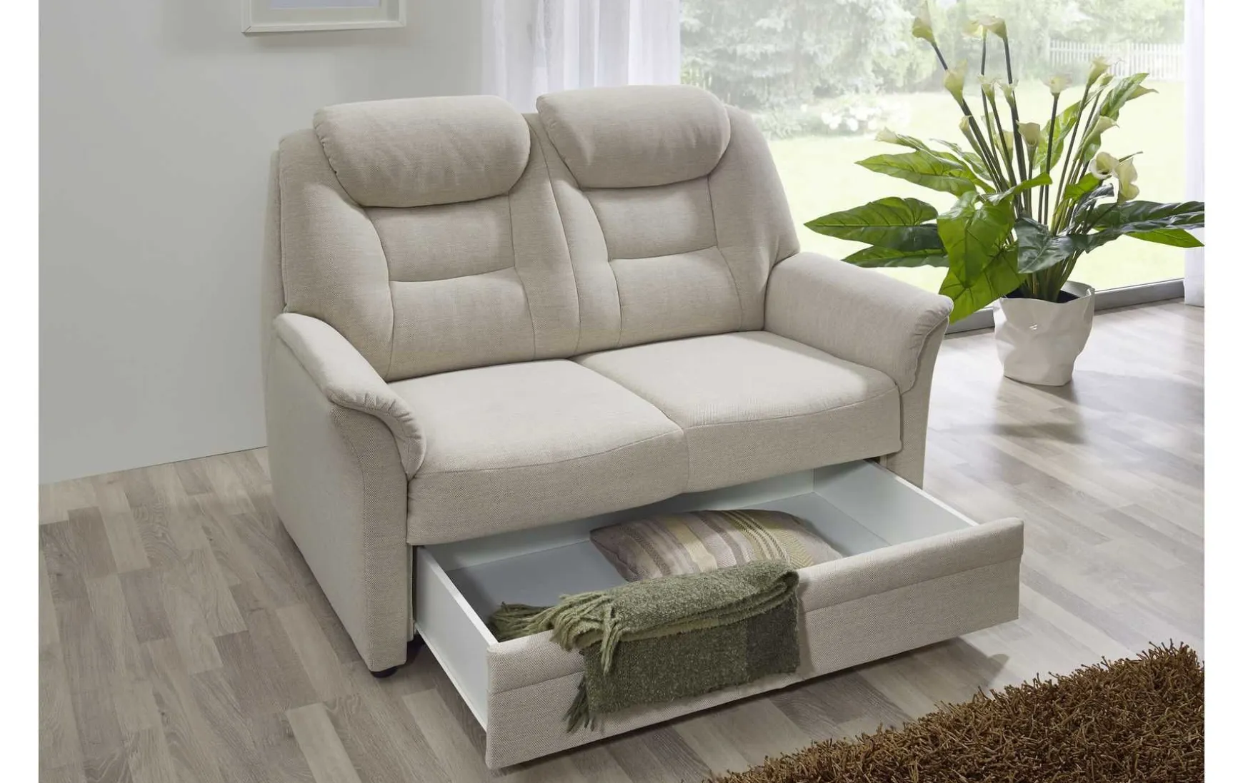 - Gegen Mehrpreis erhältlich: Kopfteilverstellung und Vorziehfunktion mit integriertem Stauraum