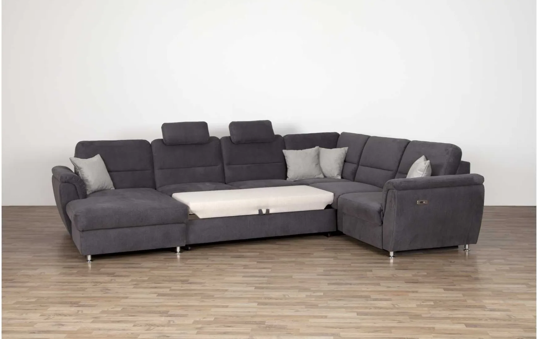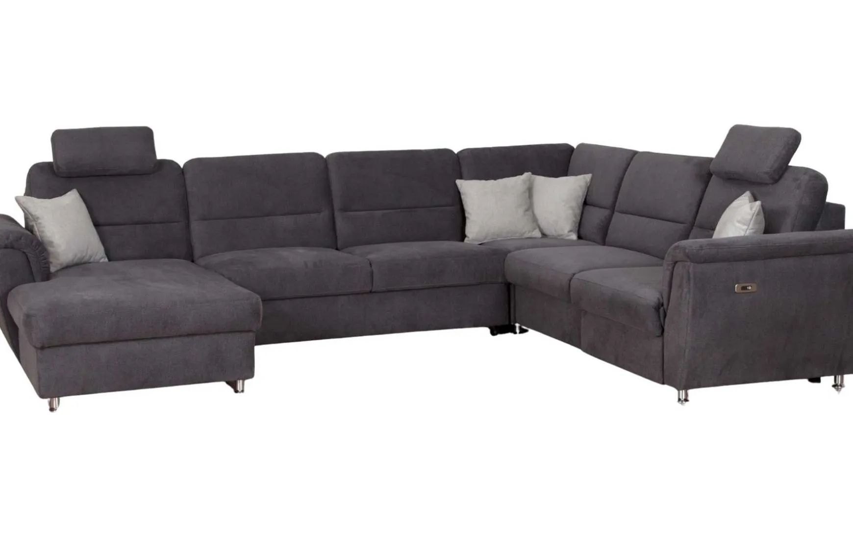 Diese großzügige Wohnlandschaft überzeugt durch modernen Komfort, funktionale Ausstattung und ein zeitloses Design. Mit einer Breite von ca. 345 cm sowie einem Schenkelmaß von ca. 167 cm links und 268 cm rechts bietet sie reichlich Platz zum Entspannen, Sitzen und Liegen. Der hochwertige Stoffbezug in elegantem Dunkelgrau fügt sich harmonisch in unterschiedliche Wohnstile ein. Dank integrierter Relaxfunktion genießen Sie höchsten Sitzkomfort, während die praktische Schlaffunktion die Wohnlandschaft im Handumdrehen in eine komfortable Liegefläche von ca. 121 × 275 cm verwandelt. Rücken und Liegefläche sind echt bezogen, sodass das Sofa frei im Raum platziert werden kann. Der Sitzkomfort aus formstabilem Kaltschaum sorgt für angenehmes und langlebiges Sitzen.