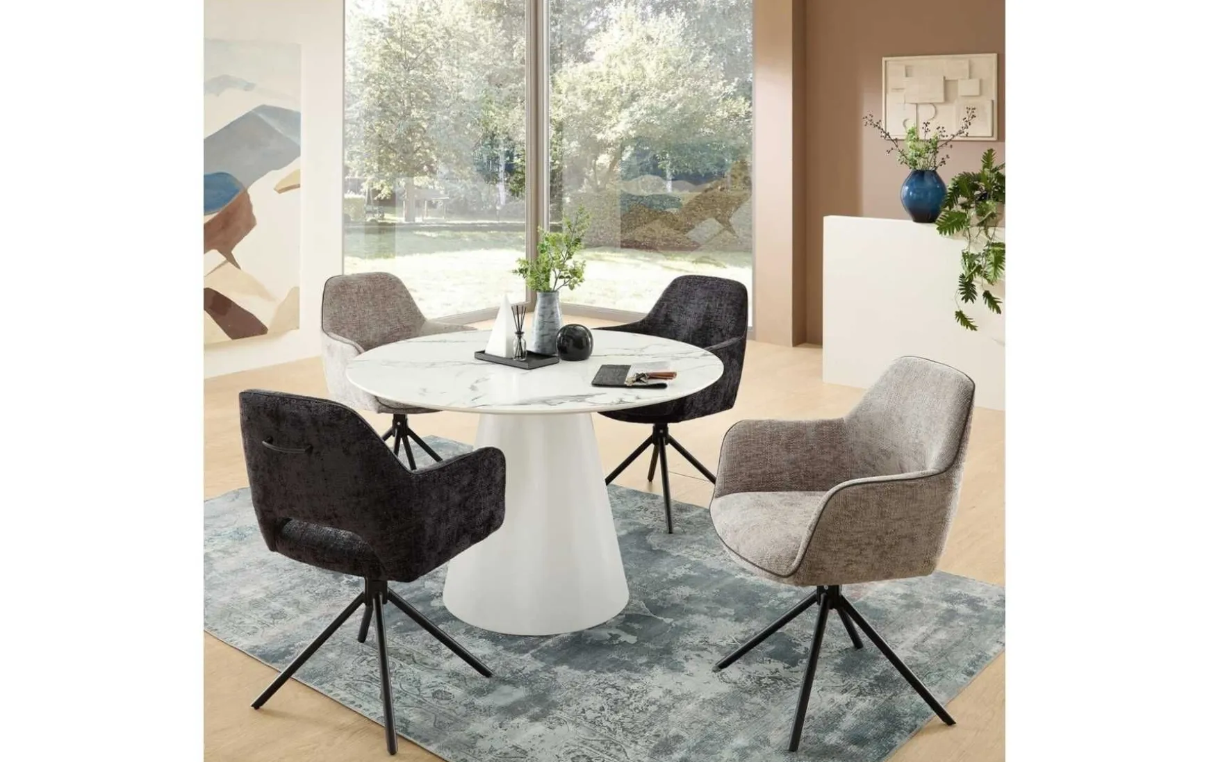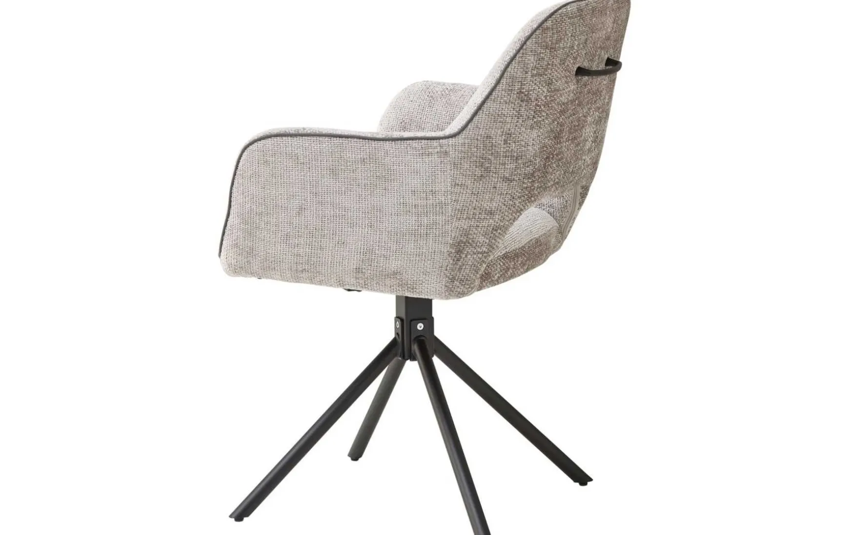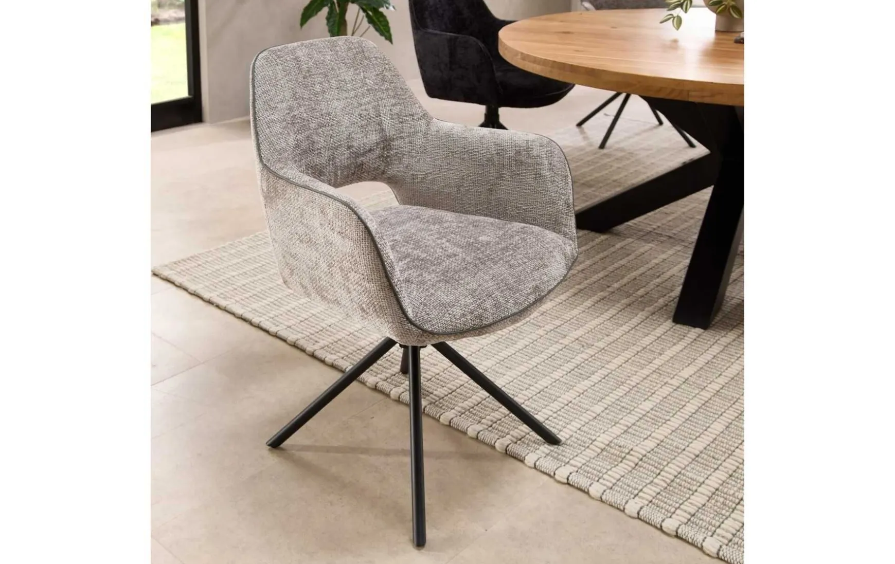 Dieser moderne Esszimmerstuhl in Grau überzeugt durch stilvolles Design und hohen Sitzkomfort. Der hochwertige Strukturstoffbezug verleiht dem Stuhl eine elegante, zeitgemäße Optik, während die schwarze Keder-Absetzung raffinierte Akzente setzt. Das stabile Metallgestell in Schwarz unterstreicht den modernen Look und sorgt für sicheren Stand. Dank der 180° Drehfunktion mit Auto-Return bleibt Ihr Essbereich stets ordentlich – der Sitz dreht sich flexibel und kehrt automatisch in seine Ausgangsposition zurück. Für zusätzlichen Komfort sorgt der integrierte Federkern-Sitz, der auch bei längeren Abenden ein angenehmes Sitzgefühl bietet. Mit den Maßen 62 x 89 x 62 cm (B/H/T) und einer Sitzhöhe von 50 cm eignet sich der Stuhl ideal für Esstisch, Wohnbereich oder Homeoffice. Die Lieferung erfolgt zerlegt zur einfachen Montage.