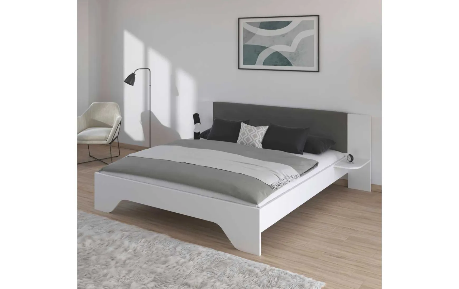 Dieses Bett mit 180 x 200 cm Liegefläche überzeugt durch sein modernes Design und eine praktische, integrierte Nachttischablage. Die großzügige Liegefläche bietet optimalen Komfort für zwei Personen und schafft eine entspannte Wohlfühlatmosphäre im Schlafzimmer. Die integrierte Ablage ersetzt klassische Nachttische und bietet ausreichend Platz für Lampe, Wecker, Bücher oder Dekoration. Dadurch entsteht ein harmonisches Gesamtbild und gleichzeitig eine platzsparende Lösung – ideal für moderne Wohnkonzepte. Dank der klaren Linienführung fügt sich das Bett mühelos in verschiedene Einrichtungsstile ein – von minimalistisch bis zeitlos elegant. Ein funktionales Möbelstück, das Komfort und Design perfekt verbindet
