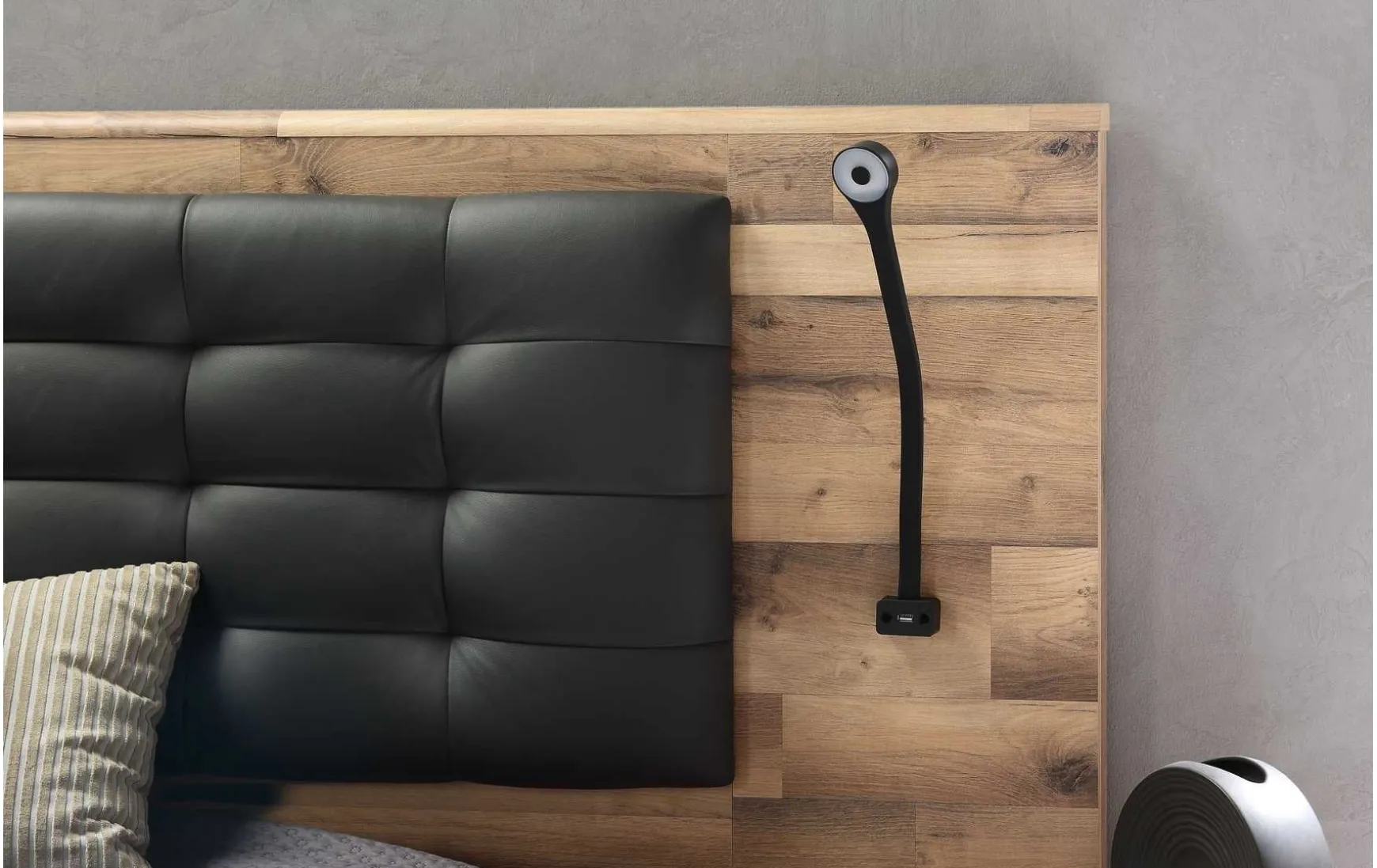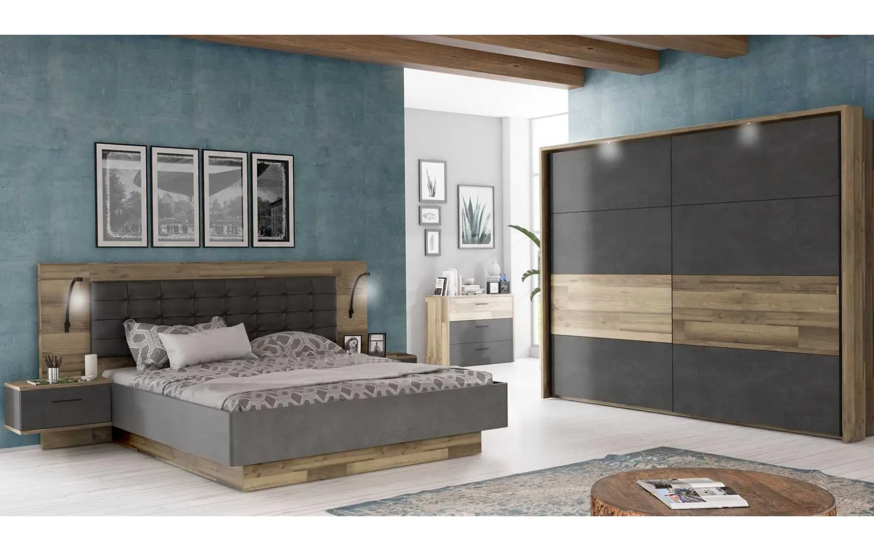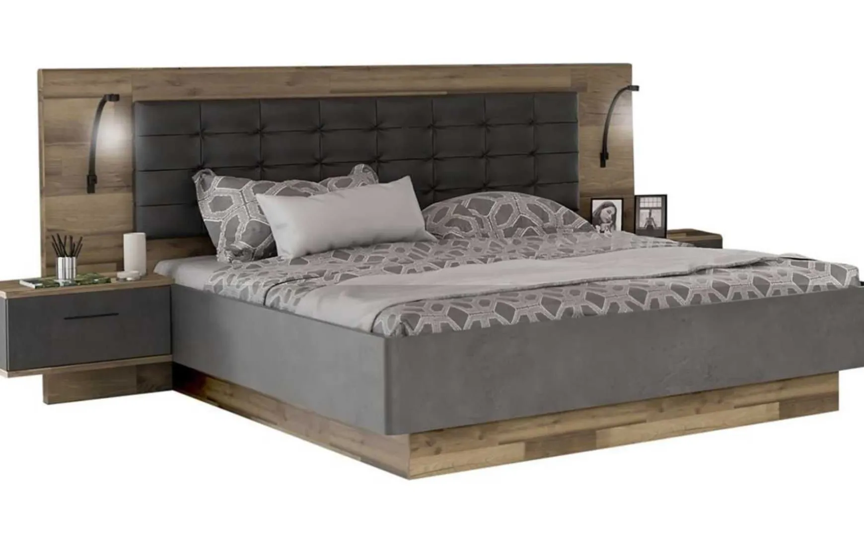 Die moderne Bettanlage mit Liegefläche ca. 180 × 200 cm vereint zeitgemäßes Design mit hohem Komfort und funktionaler Ausstattung. Die stilvolle Kombination aus Stabeiche-Dekor und Betonoptik verleiht dem Schlafzimmer eine elegante, urbane Ausstrahlung. Das gepolsterte Kopfteil aus anthrazitfarbenem Kunstleder sorgt für angenehmen Komfort beim Anlehnen und unterstreicht den modernen Charakter der Bettanlage. Im Lieferumfang enthalten sind zwei passende Nachtkommoden, die praktischen Stauraum direkt am Bett bieten. Mit einer Gesamtbreite von ca. 297 cm, einer Tiefe von ca. 210 cm und einer Höhe von ca. 120 cm wird die Bettanlage zum markanten Mittelpunkt des Raumes. Das Bett steht auf einem Sockel und ist höhenverstellbar, wodurch sich die Liegehöhe individuell anpassen lässt. Lattenrost, Matratze, Kleiderschrank und Beleuchtung sind nicht im Preis enthalten, eine Bett-Beleuchtung ist optional erhältlich. Die pflegeleichte Oberfläche kann einfach trocken abgewischt werden, zudem ist die Bettanlage auch als komplettes Schlafzimmer erhältlich.