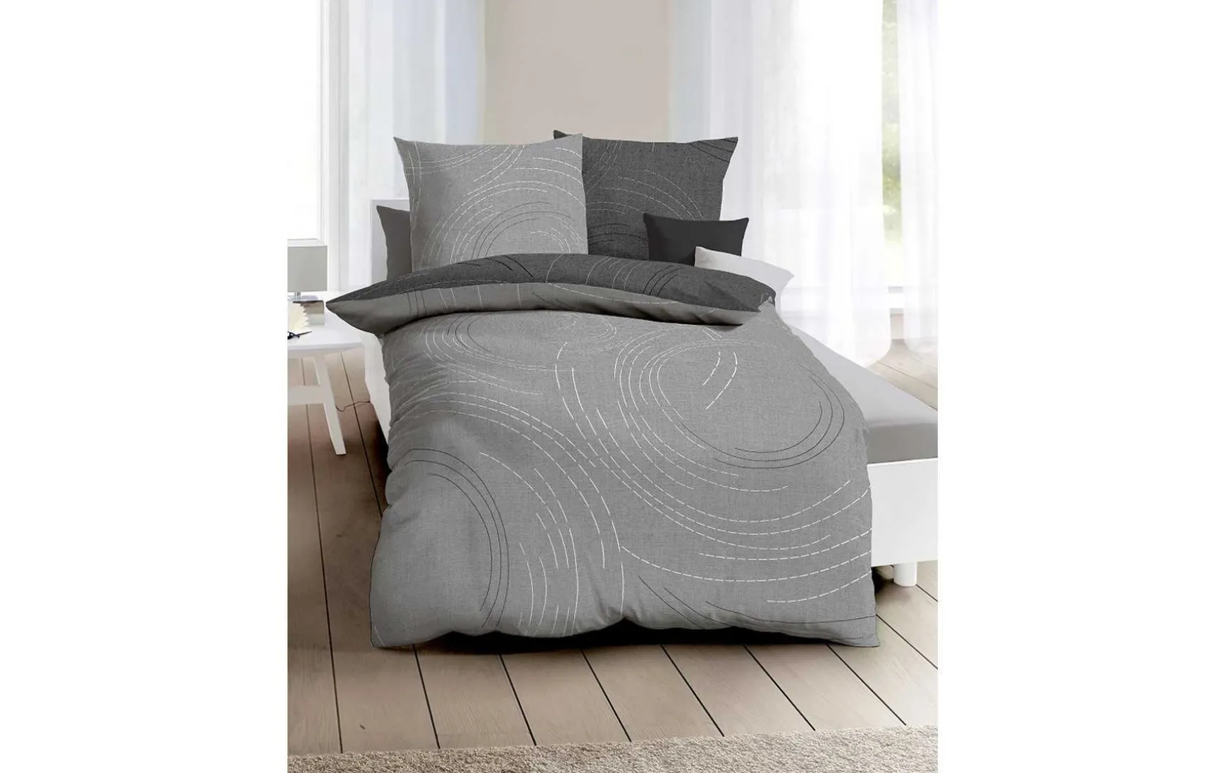 Die kreisförmigen Elemente auf der weichen Bettwäsche bestehen aus einzelnen Strichen und wirken unaufdringlich dekorativ.
