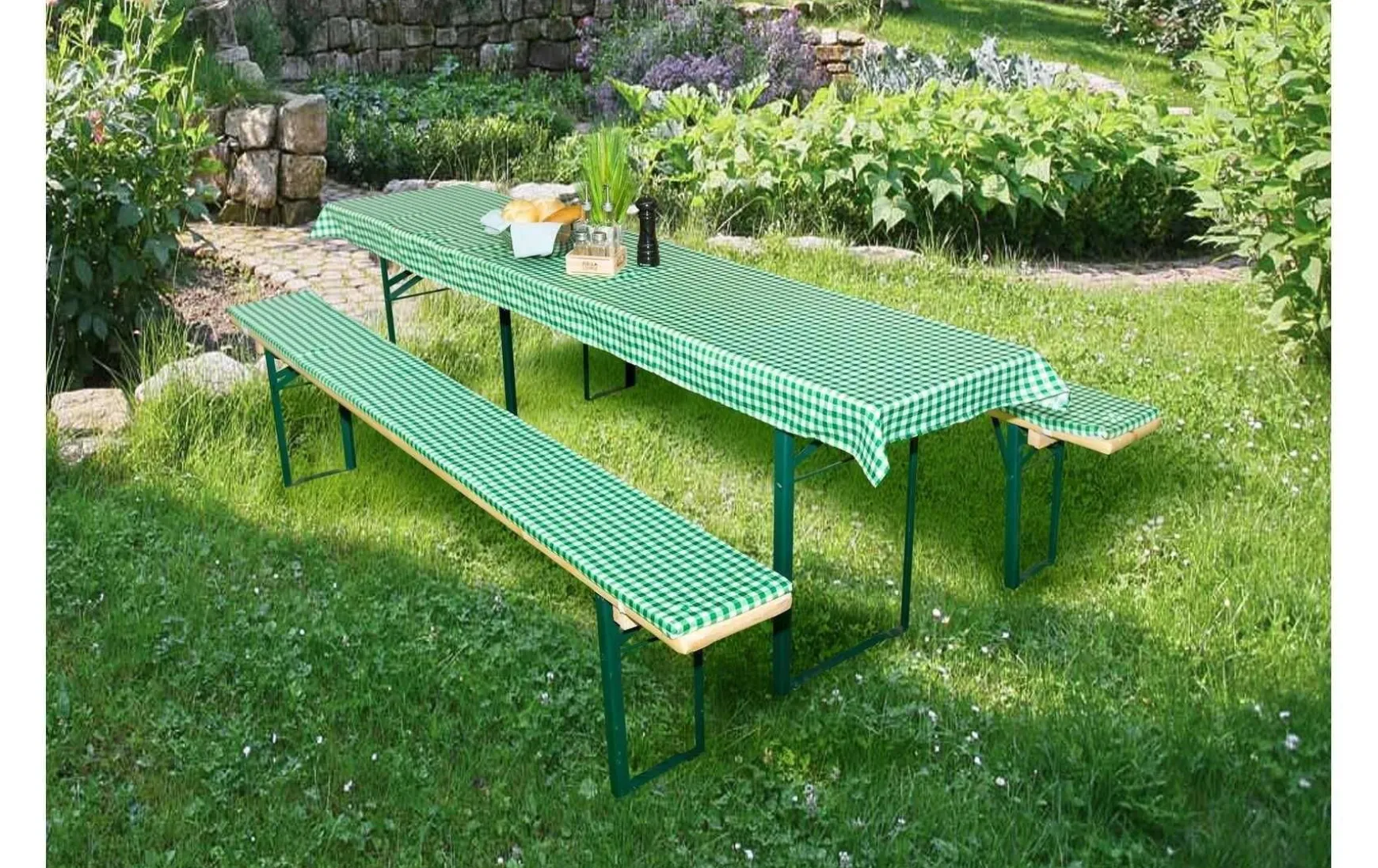 Das 3-teilige Set besteht aus einer Biertisch-Tischdecke und 2 Bierbank-Auflagen. Die beiden Bankauflagen werden mit zwei elastischen Bändern befestigt und verrutschen somit nicht.