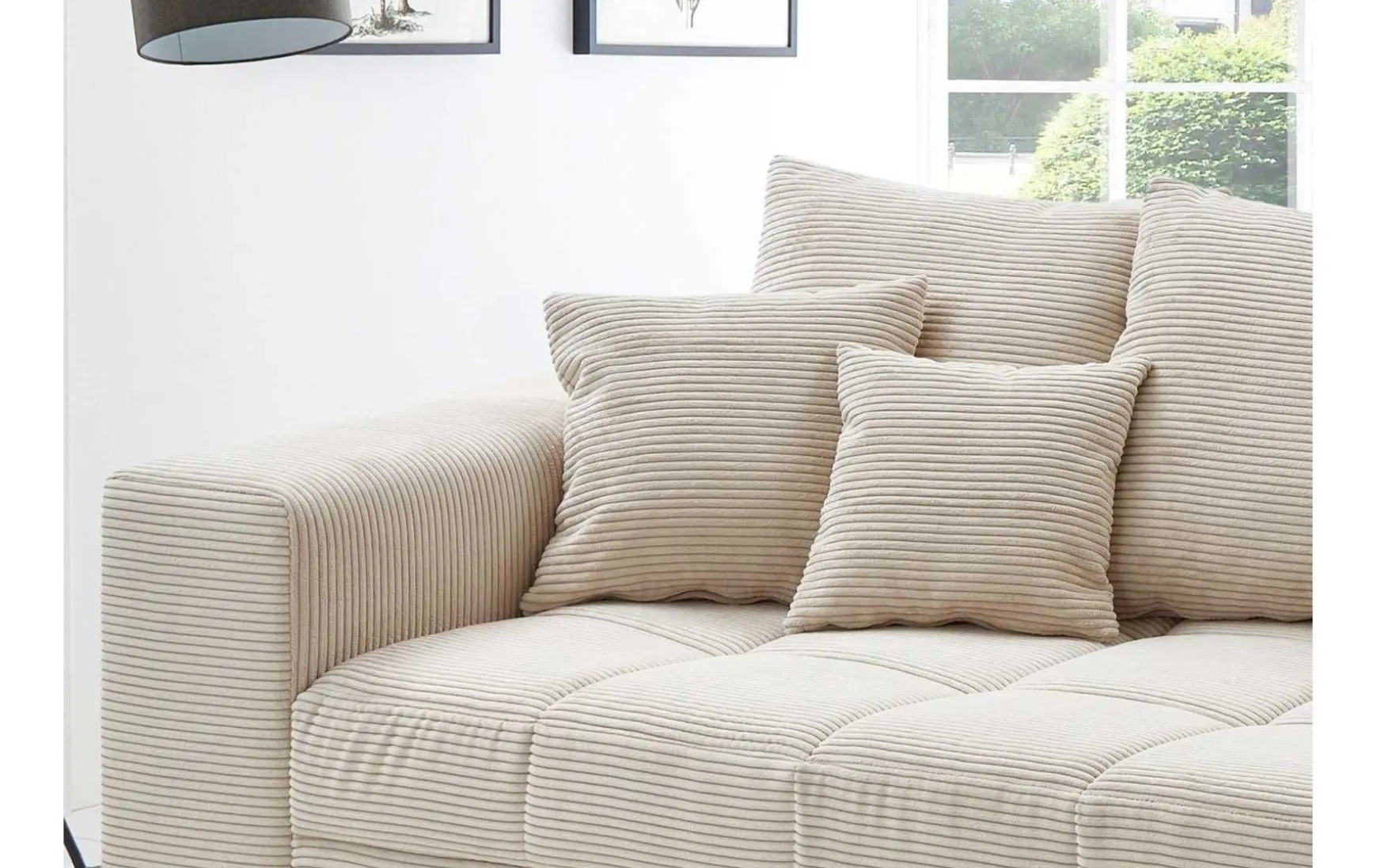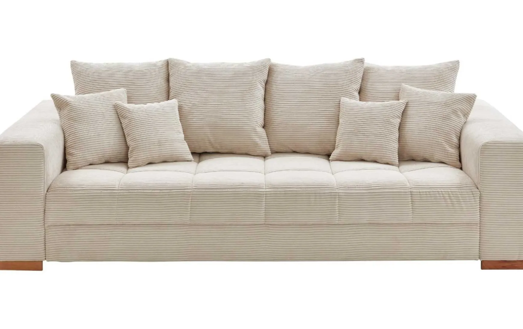 Dieses BIG Sofa besticht durch seine moderne Ausstrahlung auf einer Breite von ca. 254 cm. Der verwendete Cordbezug erfreut sich immer größerer Beliebtheit und fühlt sich zudem angenehm weich auf der Haut an. In Verbindung mit der Farbgebung in beige entsteht ein freundlicher Look, welcher sich positiv auf Ihre Wohnatmosphäre auswirken kann. Elegante Steppungen lockern das geradlinige Design auf und verleihen dem Sofa einen gemütlichen Touch. Danke des echt bezogenen Rückens können Sie das Möbel frei im Raum platzieren und Ihr Wohnzimmer flexiblen gestalten.