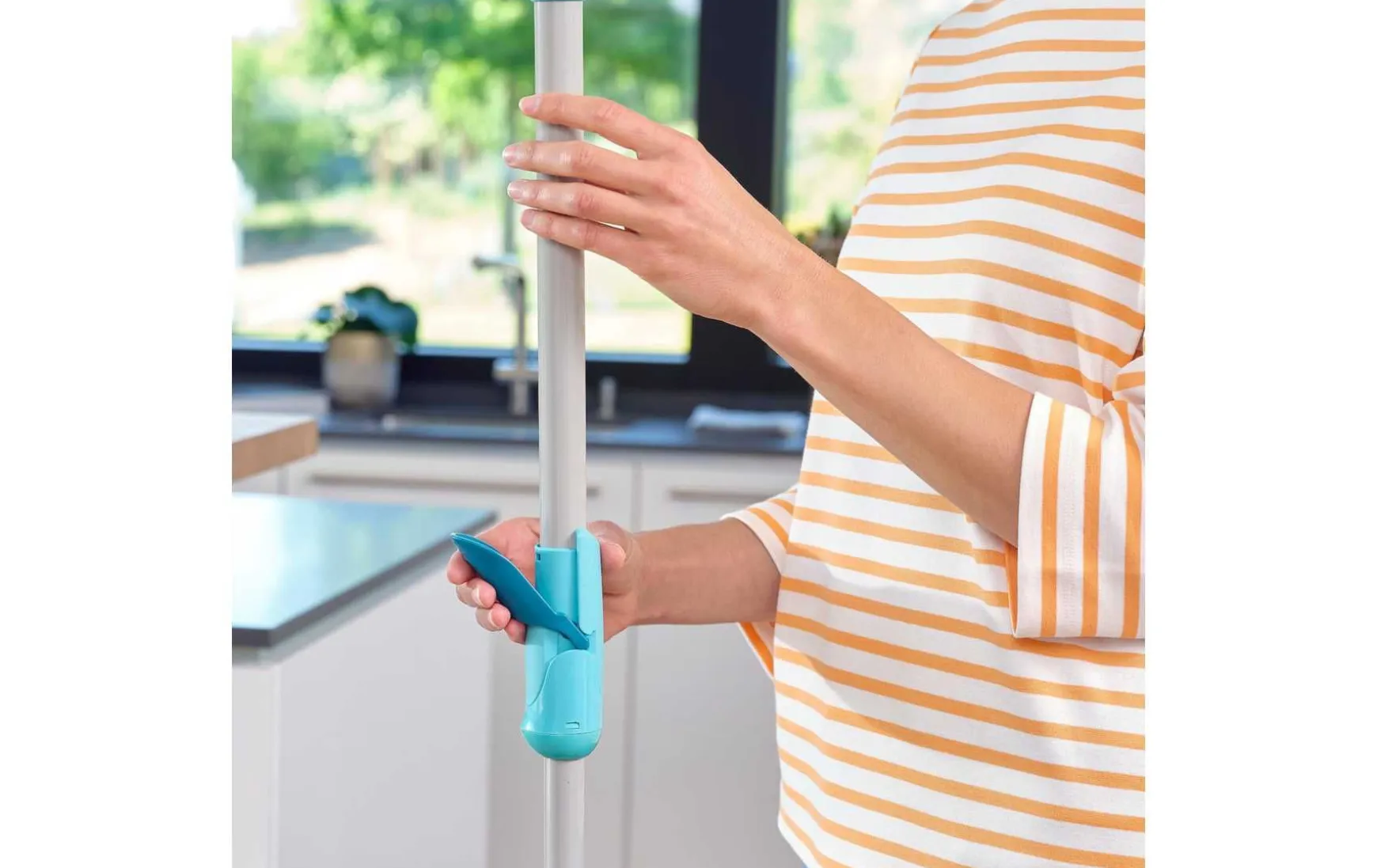Dank einzigartigem Rotationsmechanismus im Stiel wird der Bezug so trocken und sauber, dass das System gefahrlos zum Wischen von Parkett genutzt werden kann – und das ohne kräftezehrendes Auswringen des Bezugs, ohne mühseliges Bücken und vor allem keine feuchten Hände mehr.