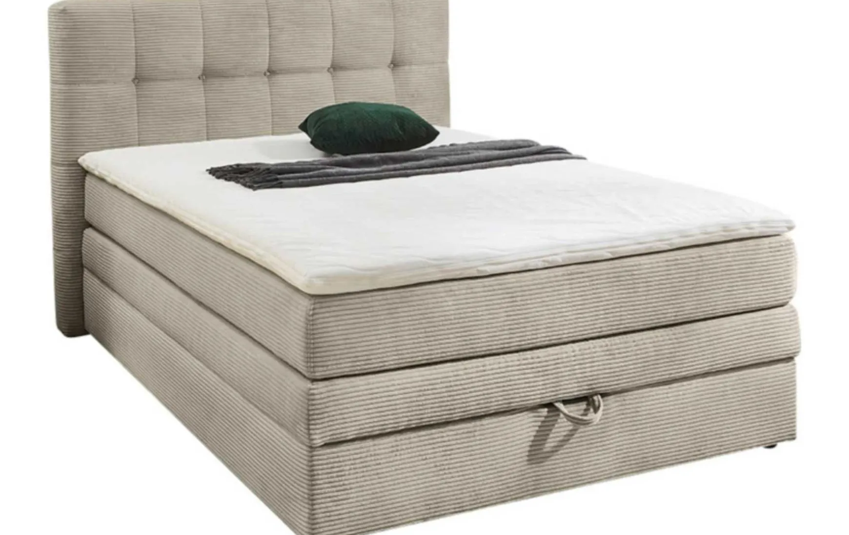 Das Boxspringbett in Beige (Light Greige) bietet hohen Schlafkomfort mit 7-Zonen-Tonnentaschenfederkern, Härtegrad H3 und komfortabler Liegehöhe von ca. 66 cm. Der große Stauraum mit Gasdruckfeder sorgt für praktische Aufbewahrung, während der inklusive Kaltschaum-Topper mit bei 60 °C waschbarem Bezug für optimale Hygiene sorgt. Bezogen mit modernem Cordstoff aus 100 % Polyester und ausgestattet mit schwarzen Füßen überzeugt das Bett durch Funktionalität und zeitloses Design.