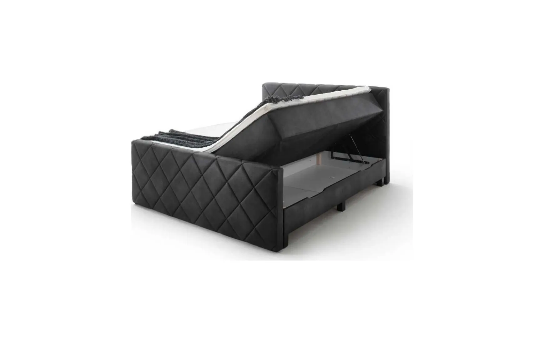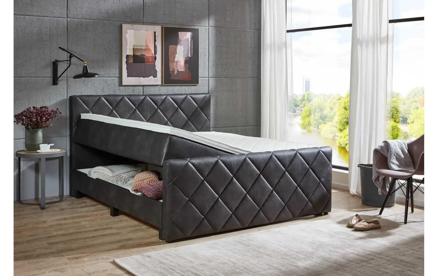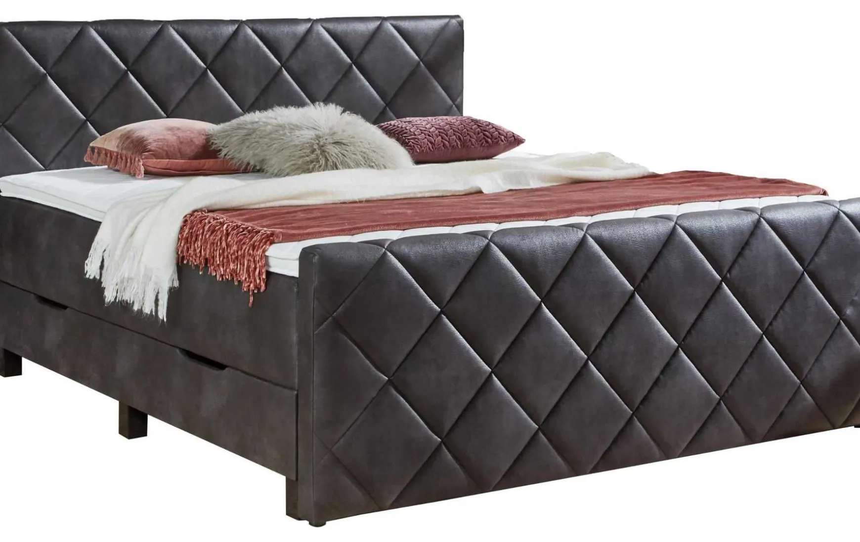 Dieses hochwertige Boxspringbett begeistert nicht nur mit seinem hervorragenden Liegekomfort, sondern auch mit seinem aufwändigen Design. Die rautenförmige Steppung auf dem robusten Kunstlederbezug unterstreicht die Geradlinigkeit dieses Bettes. Ein Schlafplatz, der sich wunderbar zu verschiedensten Einrichtungsstilen kombinieren lässt. Mit einem grauen Stoffbezug in Microfaser und einer optisch ansprechenden Rautensteppung am Kopf- und Fußteil fügt sich das Bett klassisch und doch modern in Ihr Schlafzimmer ein und verspricht dabei höchsten Liegekomfort. Innerhalb des Basisgestells befindet sich ein doppelter Bonell-Federkern, bestehend aus Bonell und Mini-Bonell im unteren, mittleren Bereich. Dieser raffinierte Aufbau sorgt für eine optimale Körperanpassung, welche durch den Komfortschaum-Topper ideal unterstützt wird. Neben dem gemütlichen Topper und der Doppelfederkern-Polsterung ist das Bett zudem mit einem Bettkasten ausgestattet, welcher reichlich Stauraum für Decken und Kissen bietet. Überzeugen auch Sie sich von dem einzigartigen und unvergesslichen Komfort des Boxspringbetts und genießen Sie erholsame Nächte auf einer Liegefläche von 180×200 cm.