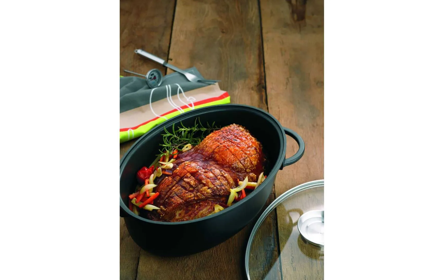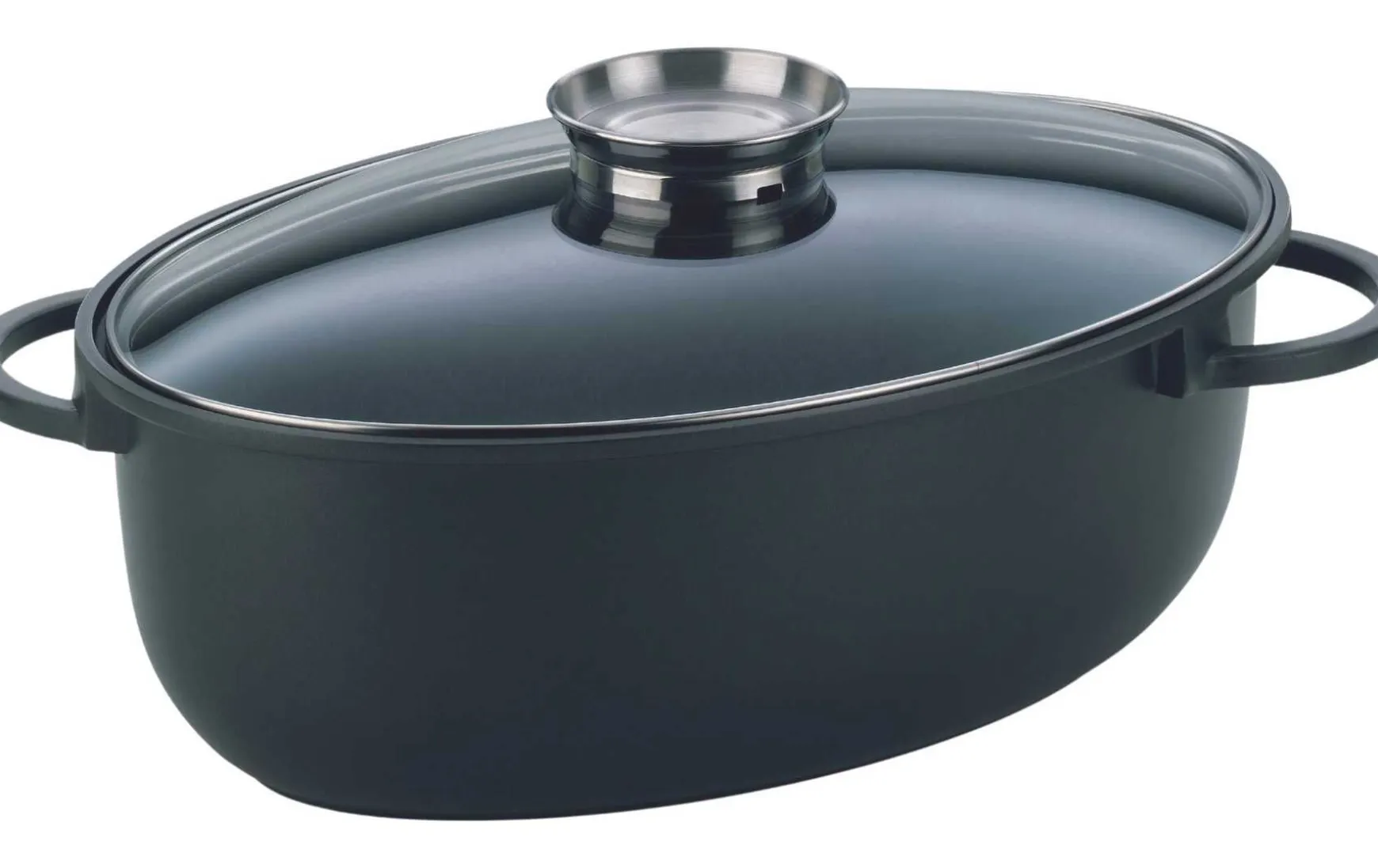 Bereiten Sie Ihren nächsten Sonntagsbraten in diesem Bräter Kerros von kela zu. Freuen Sie sich auf ein hochwertiges Küchenutensil, das erstklassigen Genuss garantiert. Der praktische Aromaknopf im Deckel tropft während des Bratvorgangs langsam Flüssigkeit wie beispielsweise Wein auf das Bratgut und verfeinert dadurch das Aroma. Gefertigt ist der Topf für Braten aus Aluguss mit GREBLON®-Stonehenge-Beschichtung, die für ein besonders gutes Garergebnis sorgt. Eine optimale Antihaftwirkung und Abriebbeständigkeit garantiert diese keramische Verstärkung im 3-Schicht-System. Der Topf ist für alle Herdarten, so auch für Induktion, geeignet und ist bis 220°C backofenfest. Die Innenmaße betragen ca. 38 x 25 cm bei einer Höhe von ca. 13,5 cm, die Außenmaße mit Deckel liegen bei ca. 45 x 28 cm bei einer Höhe von ca. 19 cm und einem Volumen von ca. 8 Liter.