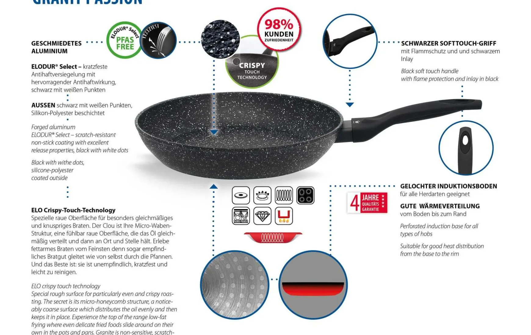 Dank dieser Struktur erleben Sie eine herausragende fettarme Braterfahrung, bei der selbst empfindliche Lebensmittel mühelos durch die Pfanne gleiten.