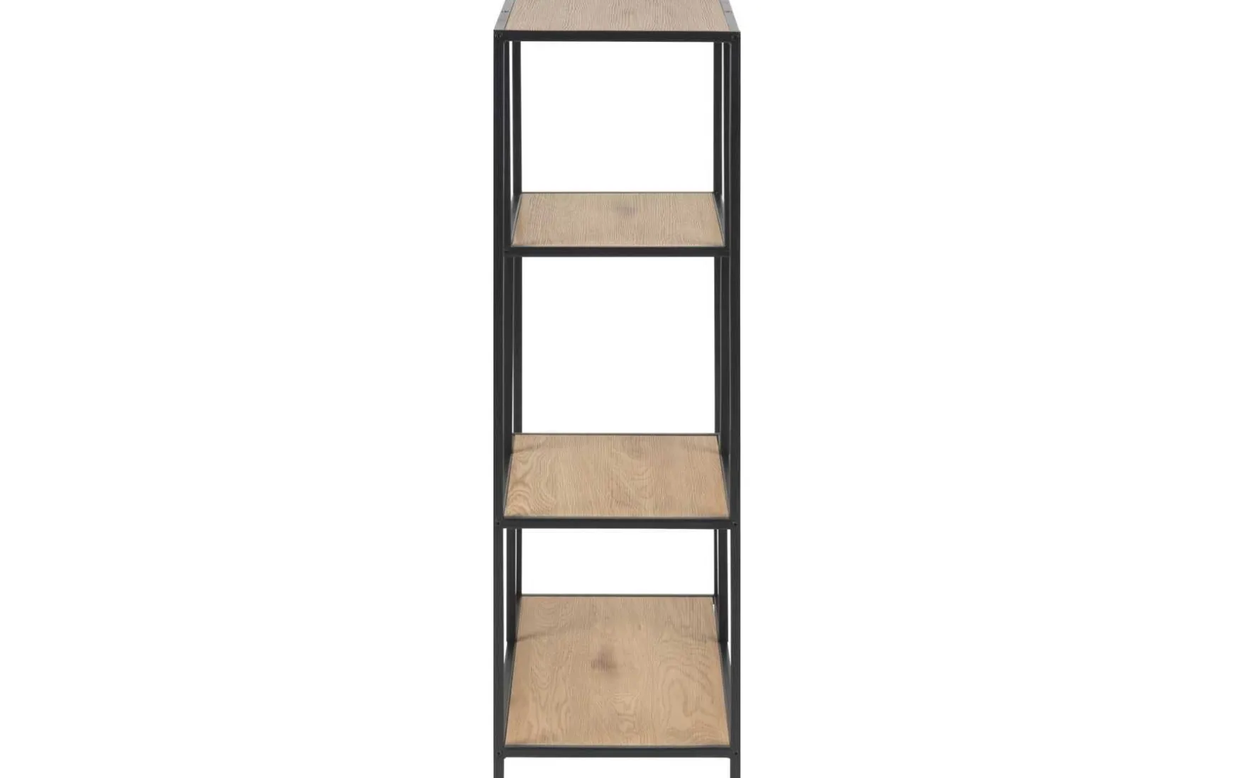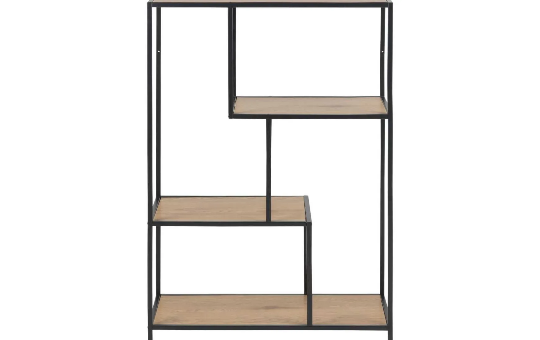 Das Bücherregal aus MDF und Metall überzeugt durch sein modernes, industrielles Design und bietet eine stilvolle Aufbewahrung für Bücher oder Dekoration. Die zwei offenen Ablageflächen aus Holz in Wildeiche Nachbildung sind asymmetrisch angeordnet und verleihen dem Regal eine besondere, moderne Optik. Das stabile Metallgestell sorgt für sicheren Stand und setzt gleichzeitig einen dekorativen Kontrast zu den Holzflächen.