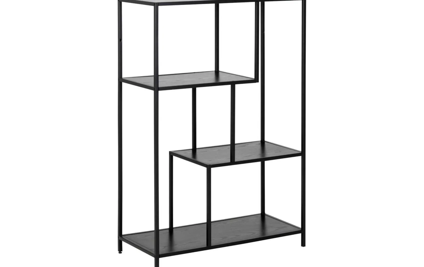 Dieses moderne Bücherregal überzeugt mit einem klaren Design und asymmetrisch angeordneten Ablageflächen im edlen Esche-Schwarz-Dekor. Das matt schwarze Metallgestell sorgt für einen stabilen Stand und verleiht dem Regal einen zeitgemäßen Industrial-Look. Durch seine kompakte Größe eignet sich das Regal ideal für Wohn-, Arbeits- oder Schlafzimmer und setzt Bücher, Deko oder Pflanzen stilvoll in Szene. Mit drei Ablageflächen, die jeweils bis zu 15 kg belastbar sind, bietet das Bücherregal ausreichend Stauraum, ohne den Raum zu dominieren. Die Kombination aus pulverbeschichtetem Metall und robusten MDF-Böden macht das Regal langlebig und pflegeleicht. Geliefert wird es zerlegt und lässt sich einfach montieren.