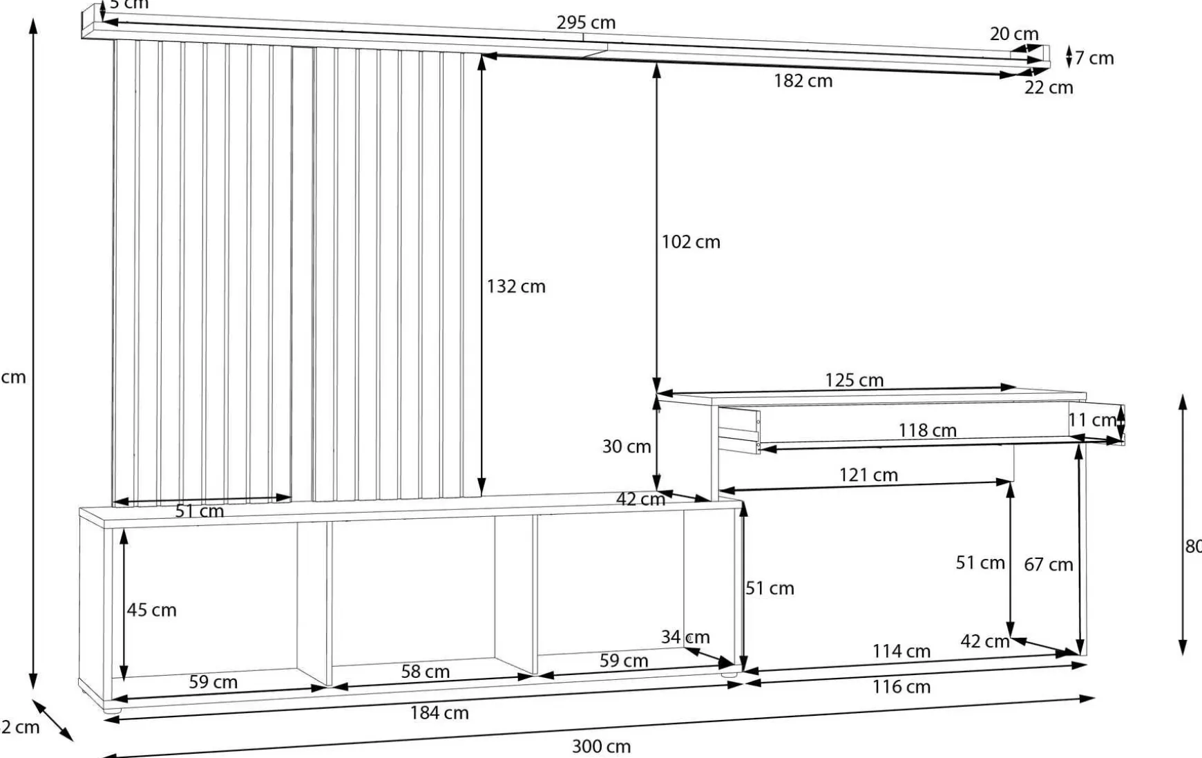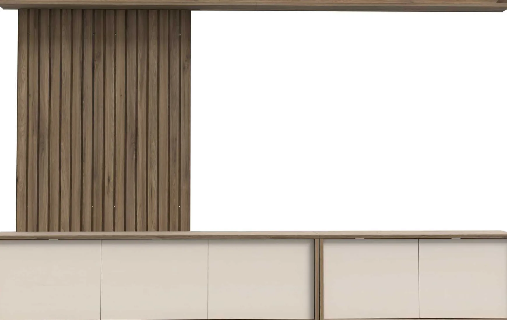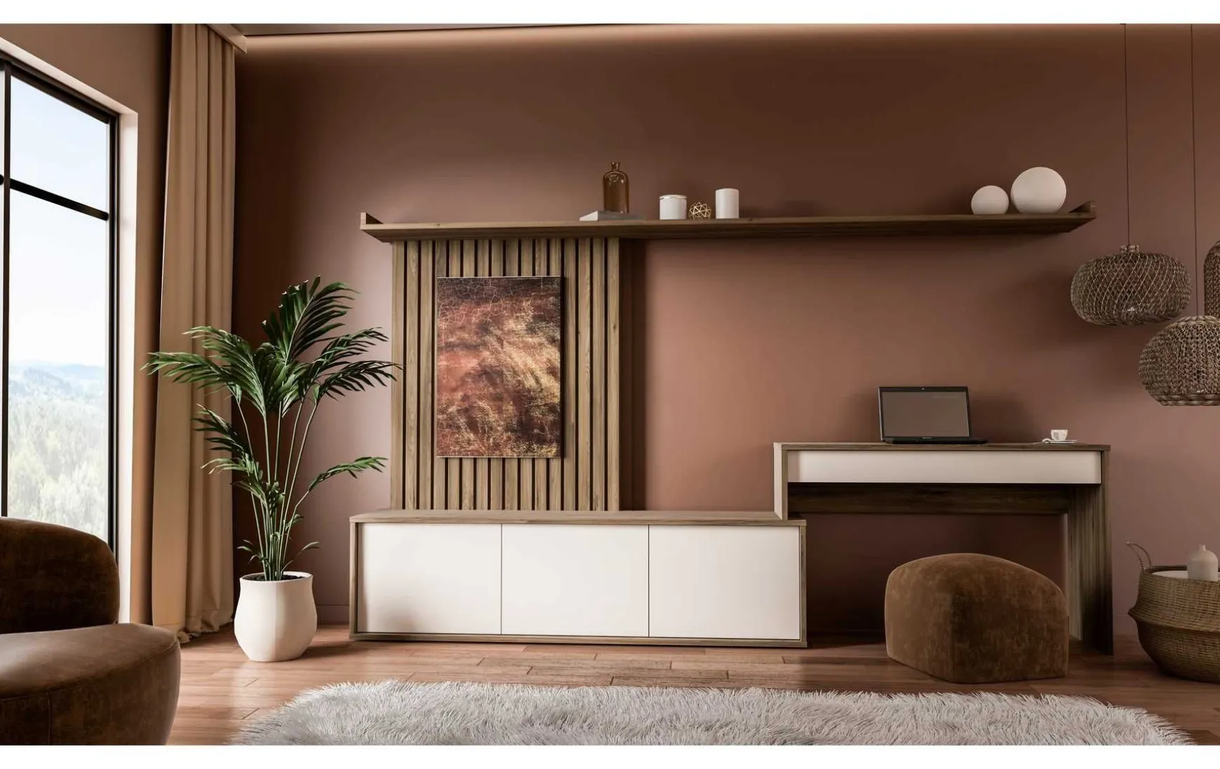 Die Home Office Wohnwand mit dem ca. Maßen:(T/B/H) 42x300x190cm ist die ideale Lösung für ein organisiertes und elegantes Wohnzimmer. Ihr gepflegtes Dekor verleiht deinem Zuhause eine warme Note. Dieses vielseitige Möbelstück verfügt über fünf praktische Türen für optimalen Stauraum. Ausserdem ermöglicht dir seine Modularität, die Konfiguration an deine Bedürfnisse und deinen Raum anzupassen. Das verwendete Holz ist FSC-zertifiziert gemischt und garantiert eine verantwortungsvolle Forstwirtschaft. Bewundere seine zwei originellen Paneele und die zwei Regale, die deinem Wohnzimmer einen unverwechselbaren Hauch von Eleganz verleihen. Die Farben Sand und Eiche fügen sich harmonisch in verschiedene Einrichtungsstile ein. Aus Spanplatte gefertigt, vereint diese Wohnwand Ästhetik und Robustheit. Die geräumigen Masse bieten viel Stauraum und verleihen deiner Wand einen stilvollen Look.