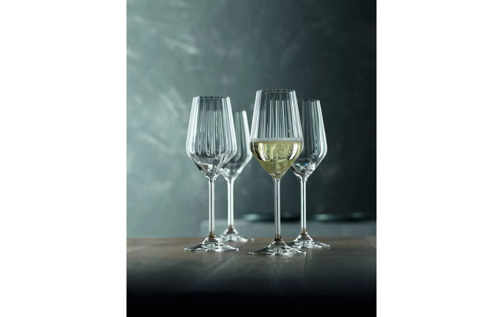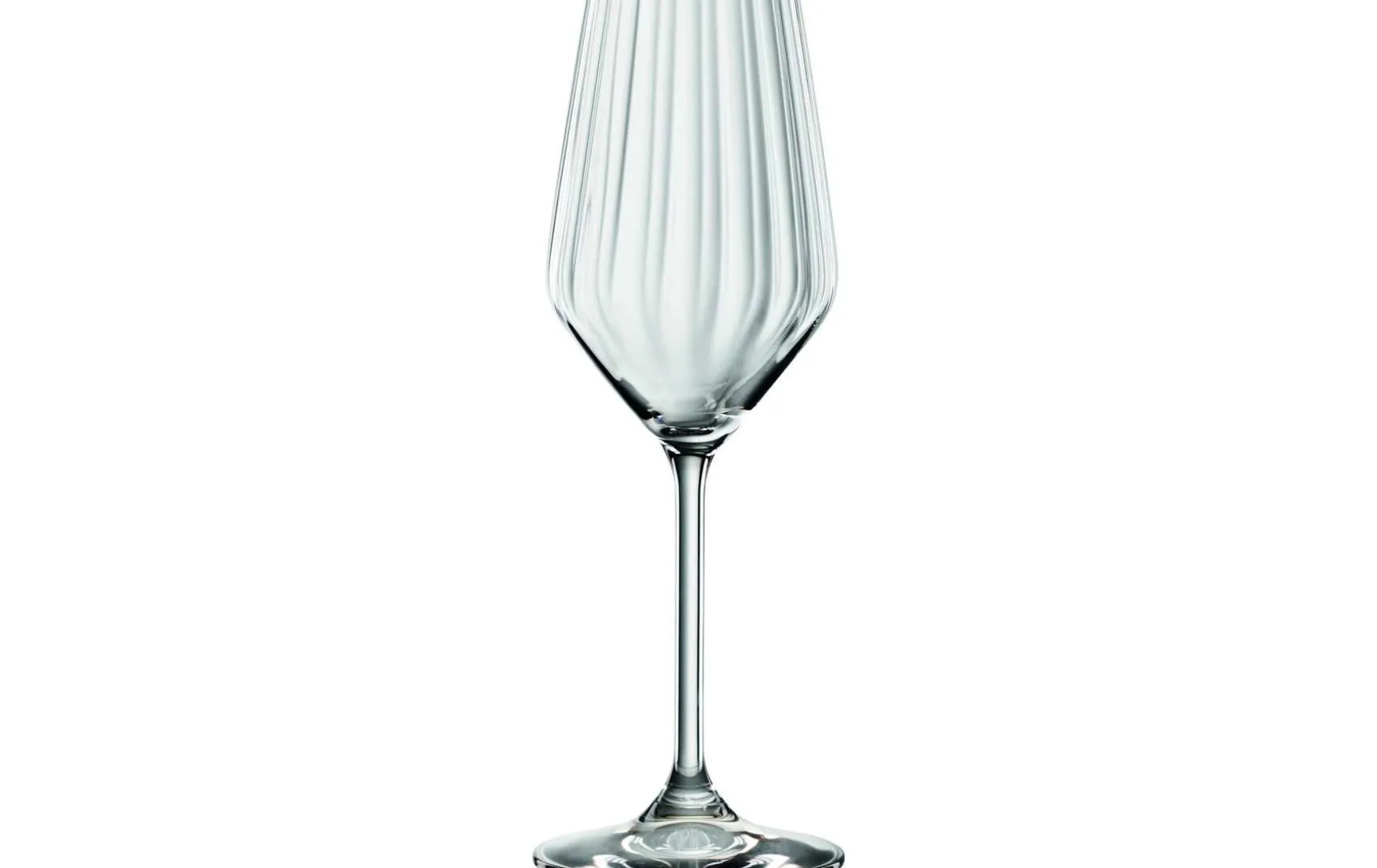 Das Champagnerglas ist perfekt, um die komplexen Eigenschaften des Champagners zu entfalten. Das diamtenförmige Glas bietet aufgrund seiner extremen Winkel mehr Raum zur Entfaltung und Entwicklung unterschiedlichster Aromen. Im Gegensatz zu einer Flöte fördert der größere Kelch das Wachstum und die Intensivierung der komplexen Champagnerschichten, der breitere Mundrand ermöglicht es diese freizusetzen, was mit einem schmalen Glas nicht vergleichbar scheint. Das Glas weist außerdem einen „Moussierpunkt“ auf, der die Bildung der Champagnerbläschen begünstigt. Dieses Glas ist perfekt für leichte, frische, trockene Champagner, Sekt, Proseccos und Schaumweine.
