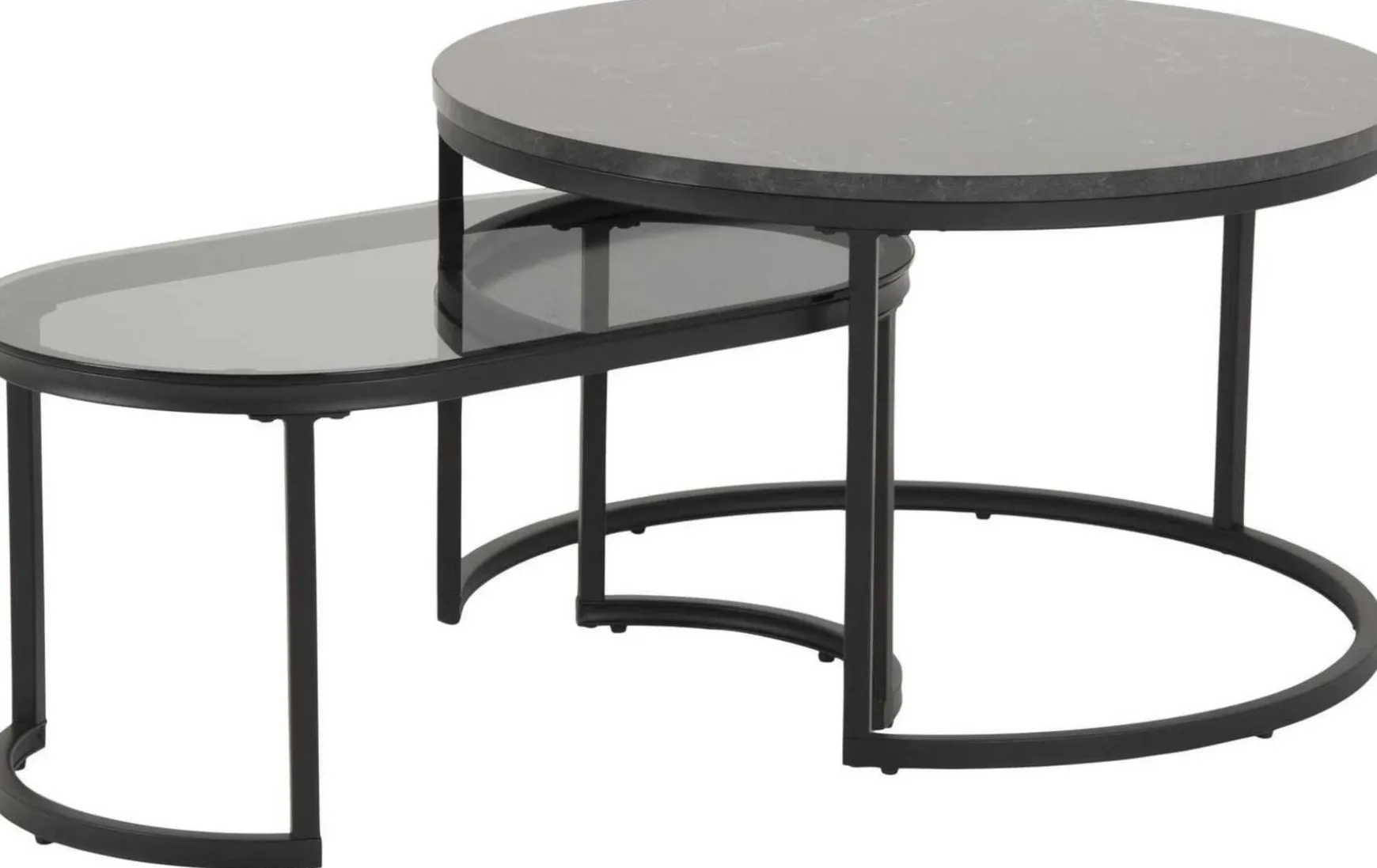 Dieser moderne Couchtisch im praktischen 2er-Set überzeugt durch sein stilvolles Zusammenspiel aus rundem und ovalem Design. Die Kombination aus schwarz gebeiztem Glas mit edlem Marmor-Print und dem schwarzen Metallgestell verleiht dem Tisch-Set eine elegante, zeitgemäße Optik. Ob zusammengeschoben oder einzeln platziert – die beiden Tische lassen sich flexibel einsetzen und passen sich unterschiedlichen Wohnsituationen an. Mit einer Höhe von ca. 42 cm und einem Durchmesser von ca. 70 cm eignen sich die Couchtische ideal als funktionaler Blickfang im Wohnbereich. Das Set wird zerlegt geliefert und ist online reservierbar.