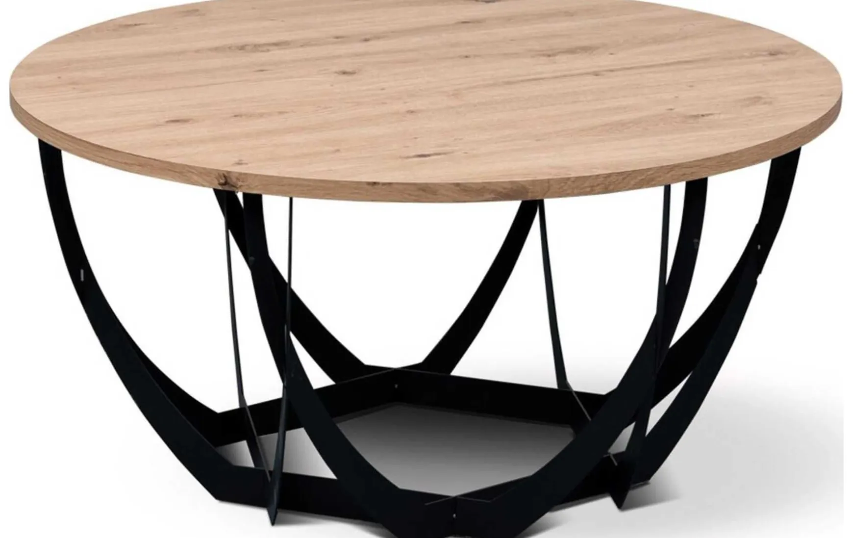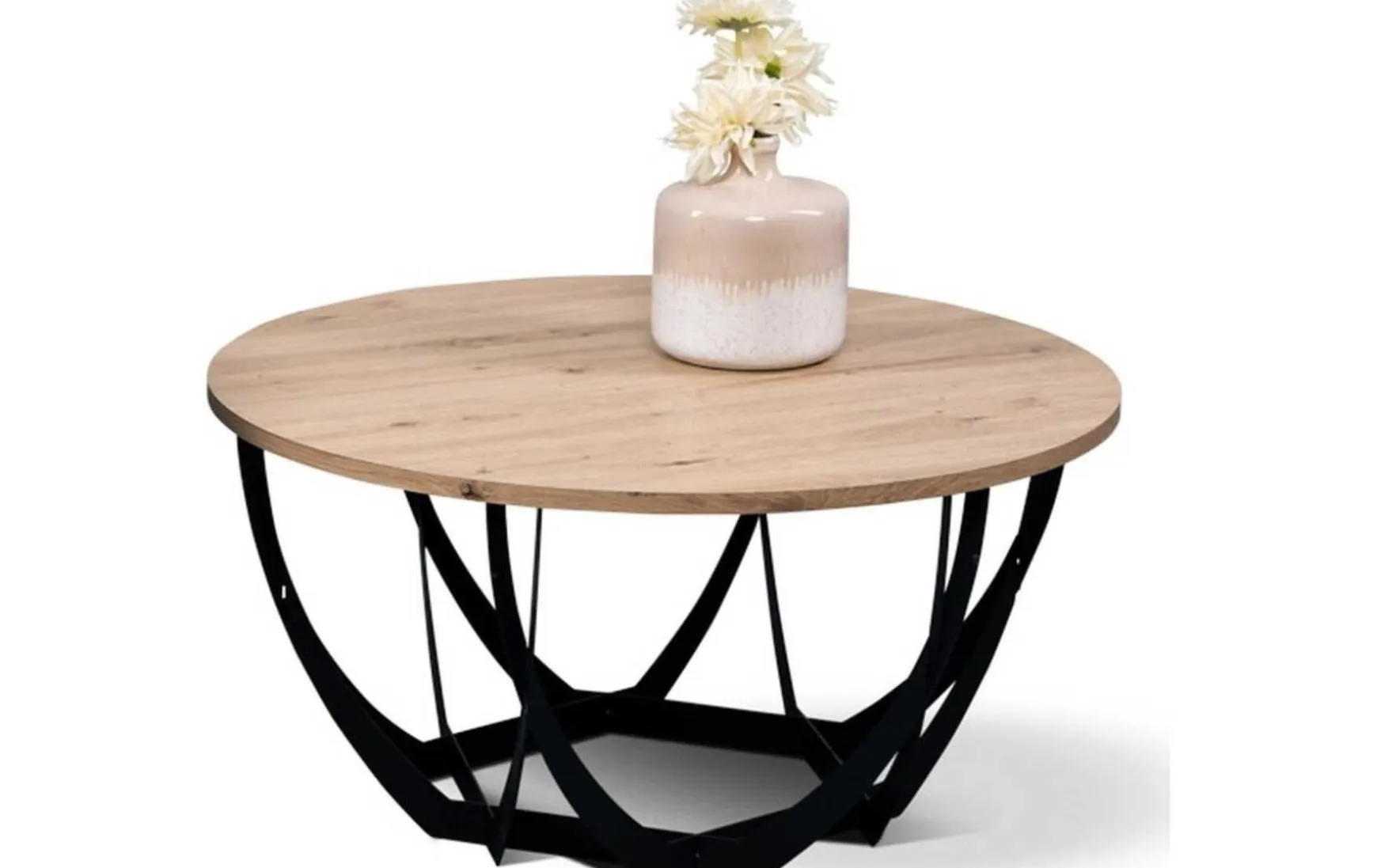 Moderner Couchtisch mit schwarzem Metallgestell und MDF-Tischplatte im Artisaneiche-Dekor. Mit 80 cm Durchmesser und 40 cm Höhe bietet er eine großzügige Ablagefläche und wird zerlegt geliefert.