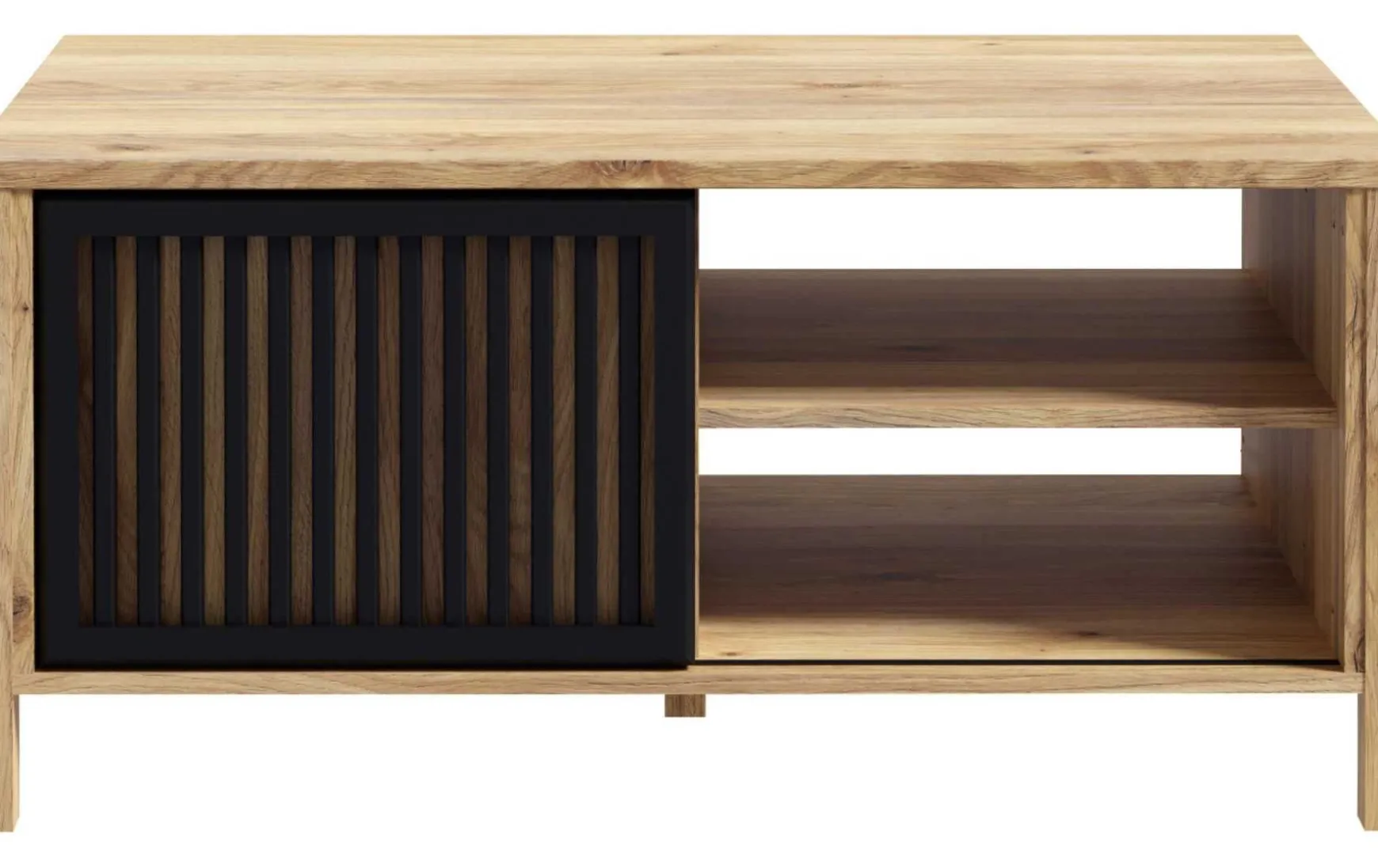 Dieser Couchtisch mit Lamellen ist eine perfekte Ergänzung für ein Wohnzimmer im modernen oder industriellen Stil. Die praktische Arbeitsplatte bietet viel Platz für Heißgetränke, Kuchen, salzige Snacks und Dekorationen. Unter der Arbeitsplatte finden Sie zwei offene Nischen, in denen Sie ein Buch, Zeitschriften, eine TV-Fernbedienung, Servietten oder Tischsets ablegen können. Hinter den stilvollen, schwarzen Lamellen-Schiebetüren verbirgt sich zusätzlicher Stauraum für Dinge, die Sie beim Entspannen griffbereit haben möchten. Dekorieren Sie das Wohnzimmer Ihrer Träume, indem Sie einen Sessel oder ein Sofa und einen Couchtisch zusammen mit anderen Möbeln aus der Kollektion in dessen Herzstück stellen.