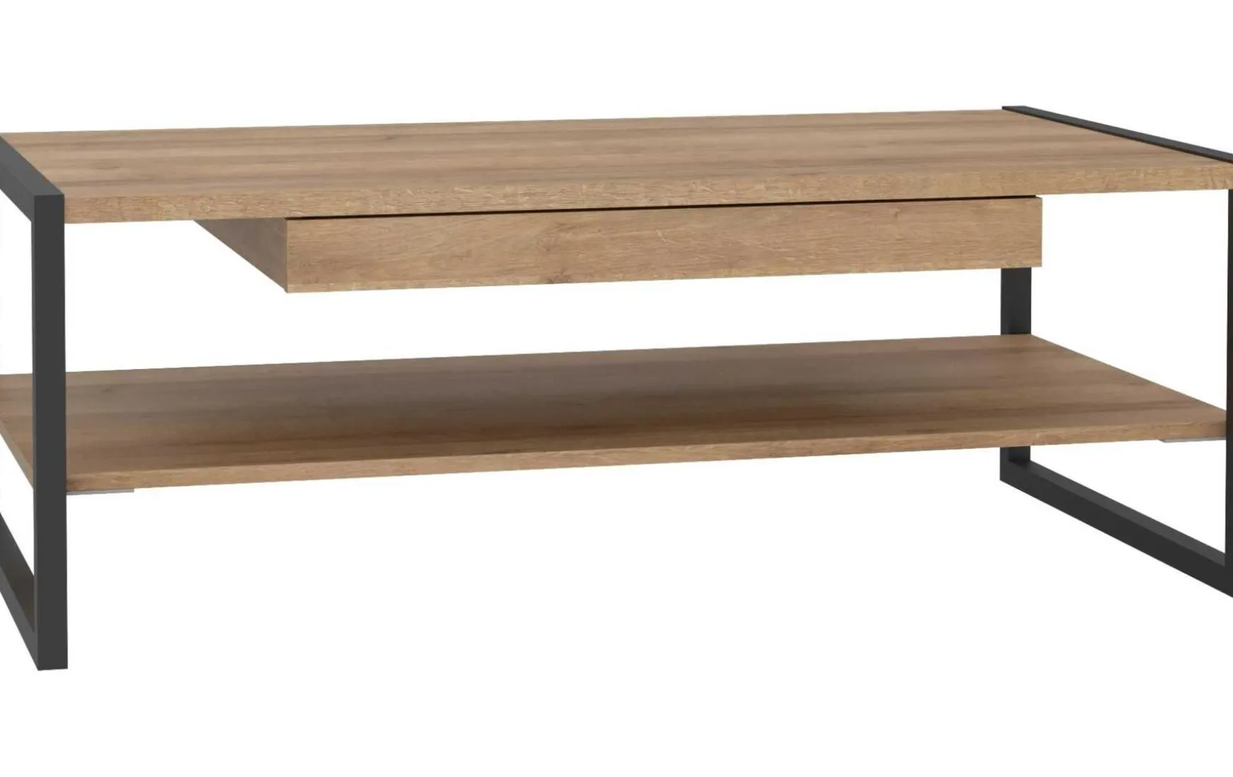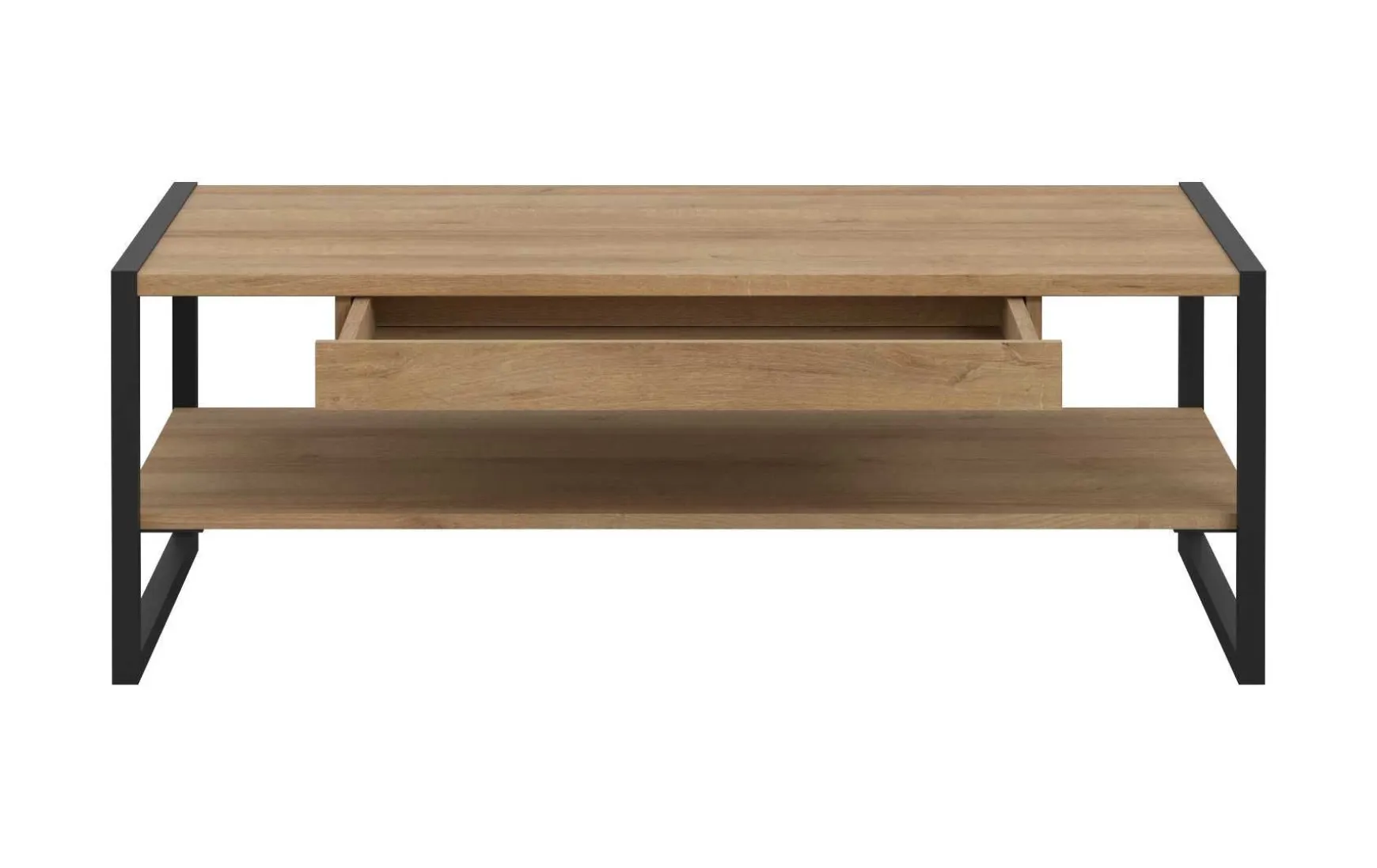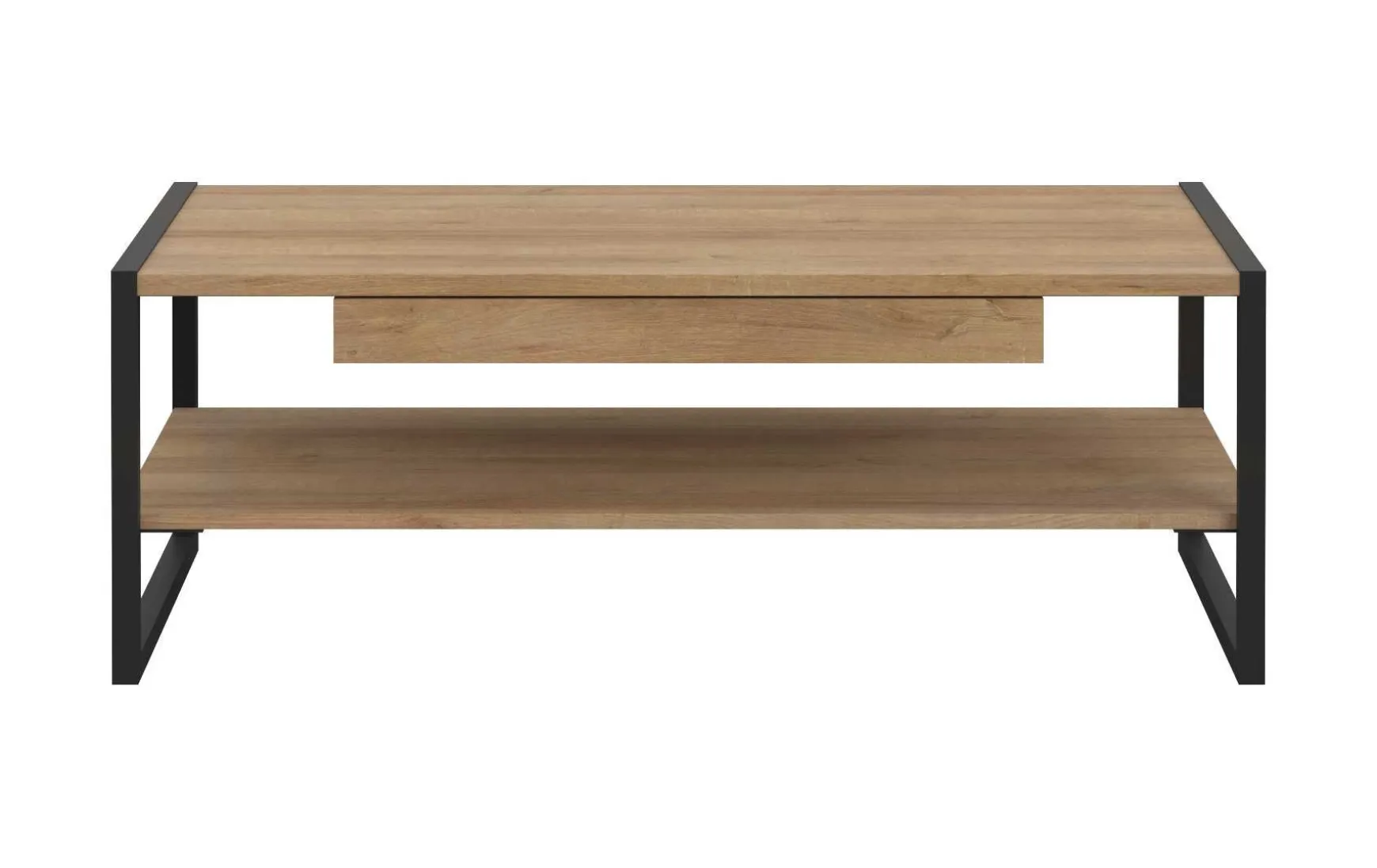 Dieser moderne Couchtisch im Riviere-Eiche-Dekor überzeugt durch eine gelungene Kombination aus natürlicher Holzoptik und markantem schwarzem Metallrahmen. Mit seinen klaren Linien und dem rechteckigen Design fügt er sich harmonisch in zeitgemäße Wohnkonzepte ein. Die großzügige Tischfläche von ca. 110 x 60 cm bietet ausreichend Platz für Alltagsgegenstände, während die integrierte Schublade zusätzlichen, praktischen Stauraum schafft. Das stabile Metallgestell sorgt für Standfestigkeit und unterstreicht den industriell-modernen Look. Der Couchtisch ist individuell konfigurierbar, online reservierbar und wird zerlegt zur einfachen Selbstmontage geliefert.