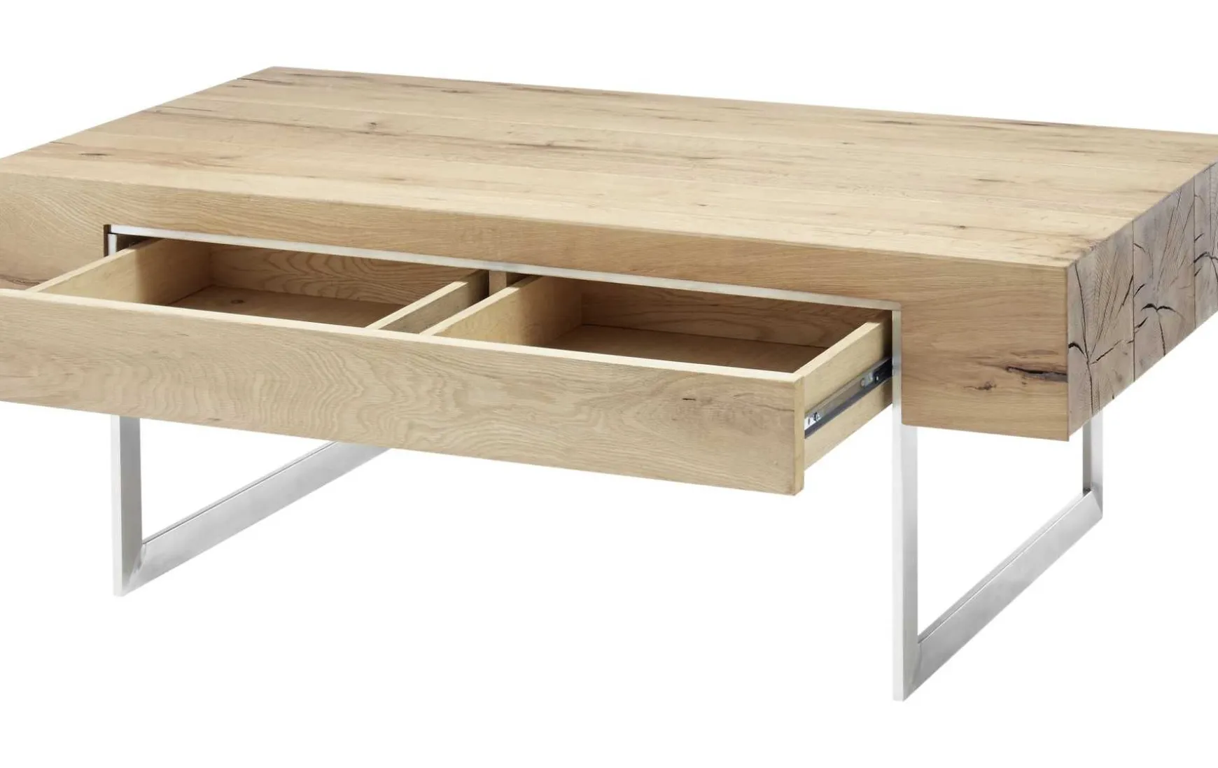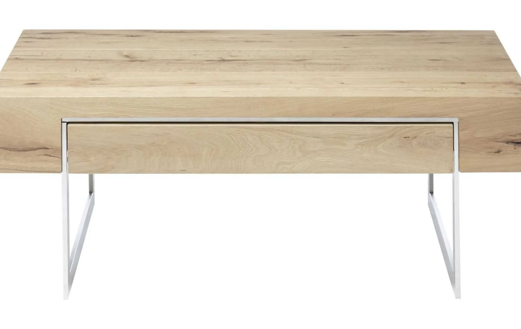 Hier tragen schmale Metallkufen in Edelstahl-Optik, die üppige Holzplatte. Dabei handelt es sich um furniertes Asteichenholz.