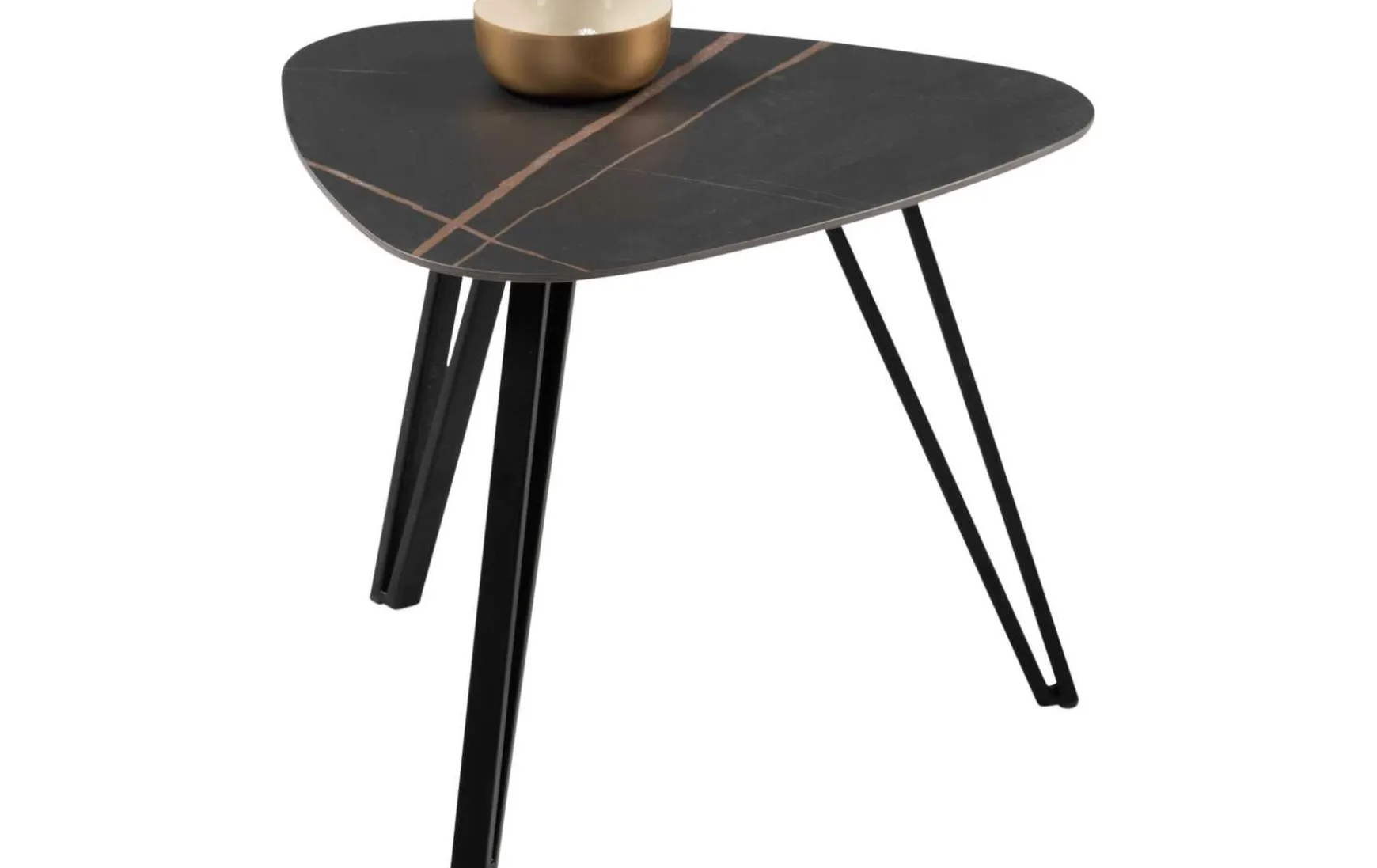 Dieser moderne Couchtisch begeistert mit einer außergewöhnlichen dreieckigen Form und einem eleganten Materialmix. Die dunkle Keramik-Deckplatte verleiht dem Tisch eine edle, zeitgemäße Ausstrahlung und ist zugleich pflegeleicht sowie widerstandsfähig. Das schwarze Metallgestell sorgt für Stabilität und unterstreicht das minimalistische Design. Dank seiner kompakten Maße eignet sich der Couchtisch ideal für moderne Wohnräume und setzt stilvolle Akzente, ohne viel Platz einzunehmen.