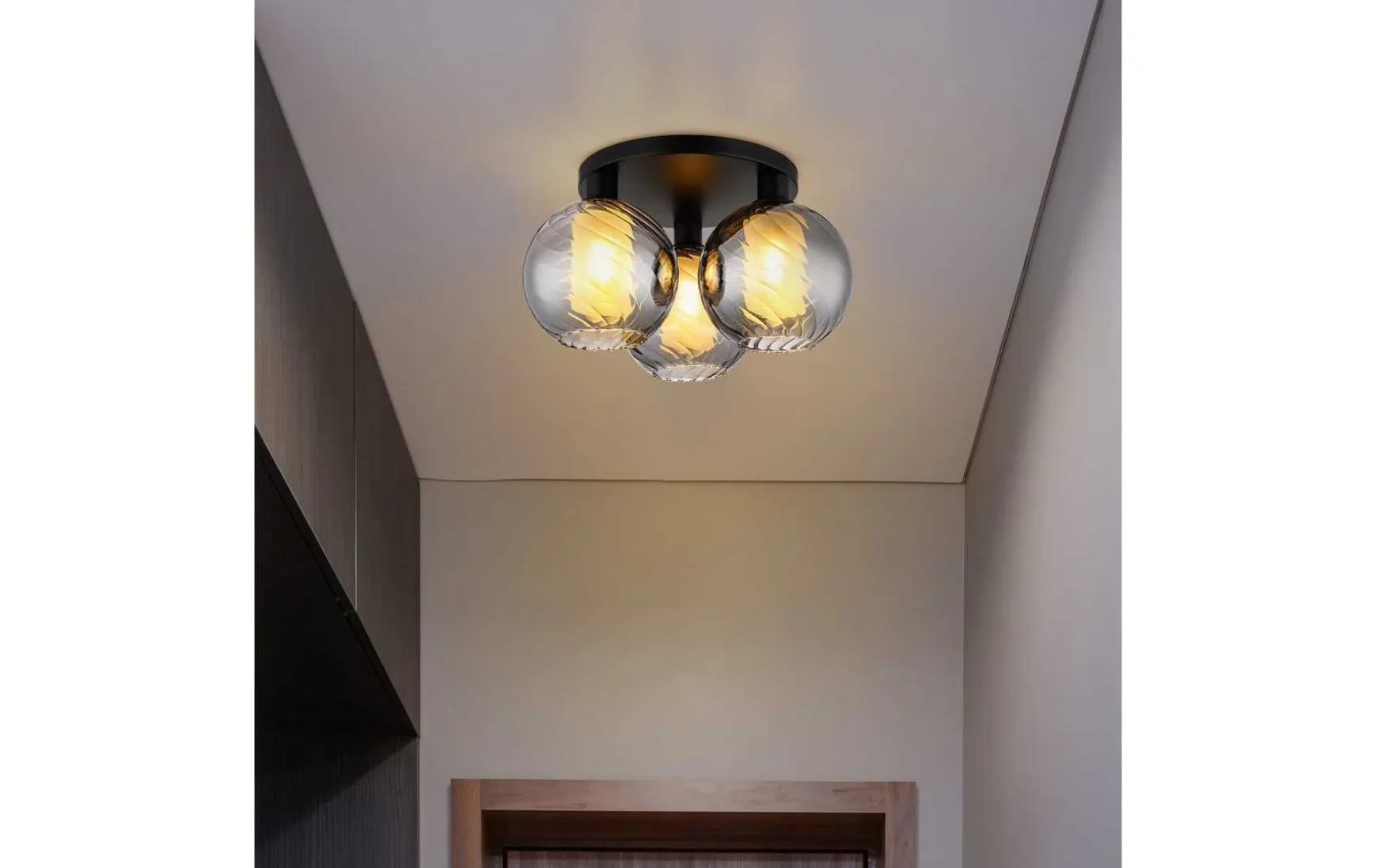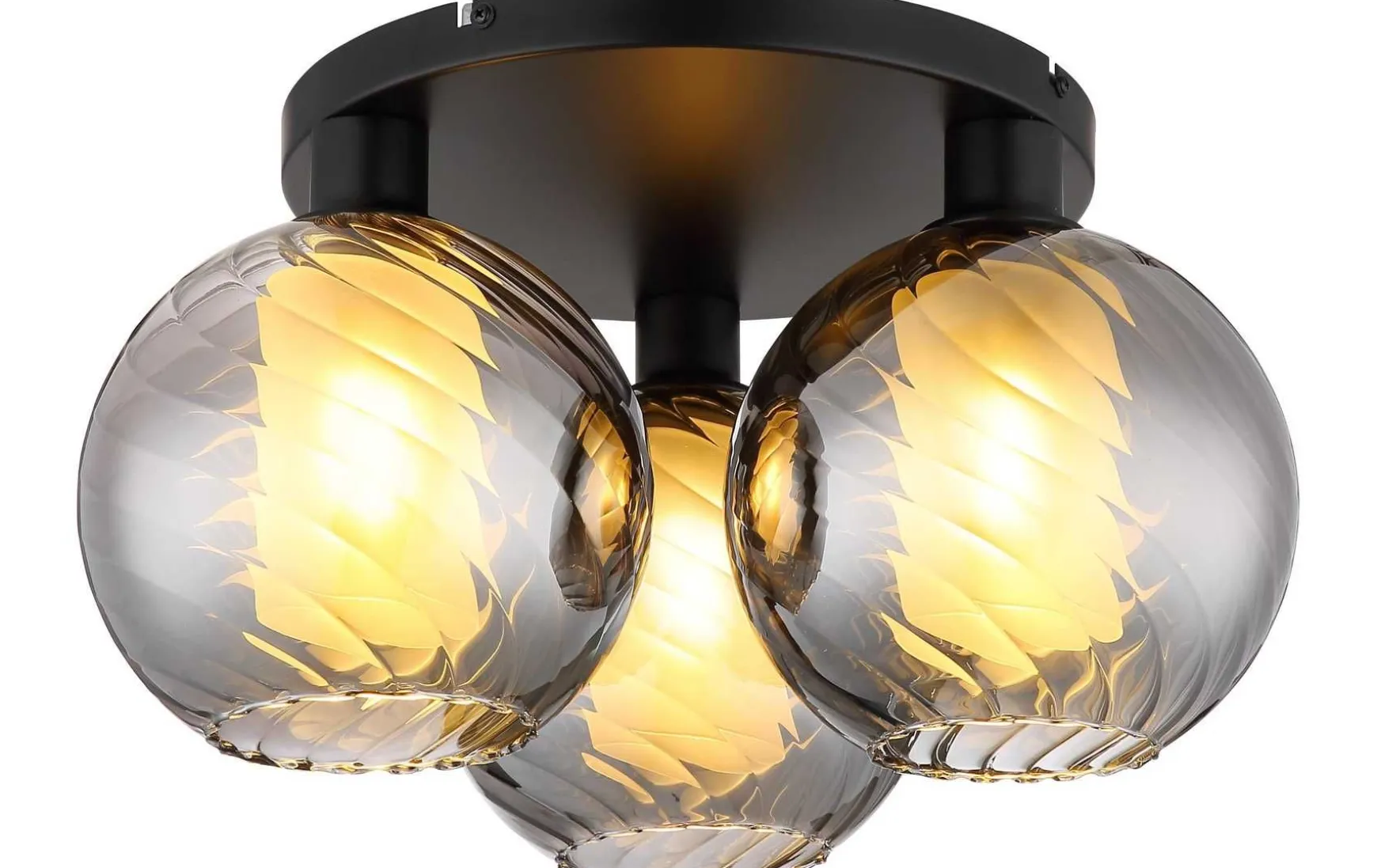 Der Korpus aus matt schwarzem Metall bildet einen eleganten Kontrast zu den drei runden Glaskugeln, die mit Rillen versehen sind und einen Glaszylinder im Inneren tragen.