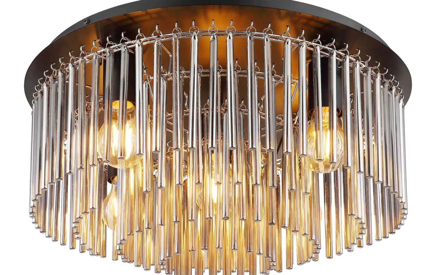 Diese Deckenleuchte besteht aus schwarz mattem Metall und rauchfarbenen Glasstäben, die in einem Durchmesser von 500 mm angeordnet sind. Die Leuchte benötigt 5 E27-Lampen mit einer Leistung von jeweils bis zu 60 W und einer Spannung von 230 V. Diese Deckenleuchte ist ein wahrer Blickfang und eignet sich hervorragend für moderne Wohnräume. Die Kombination aus schwarz mattem Metall und rauchfarbenen Glasstäben verleiht der Leuchte ein elegantes Aussehen. Die Deckenleuchte hat einen Durchmesser von 500 mm und eine Höhe von 250 mm. Sie ist ideal für Räume mit hohen Decken oder als zentrales Element in einem Raum.