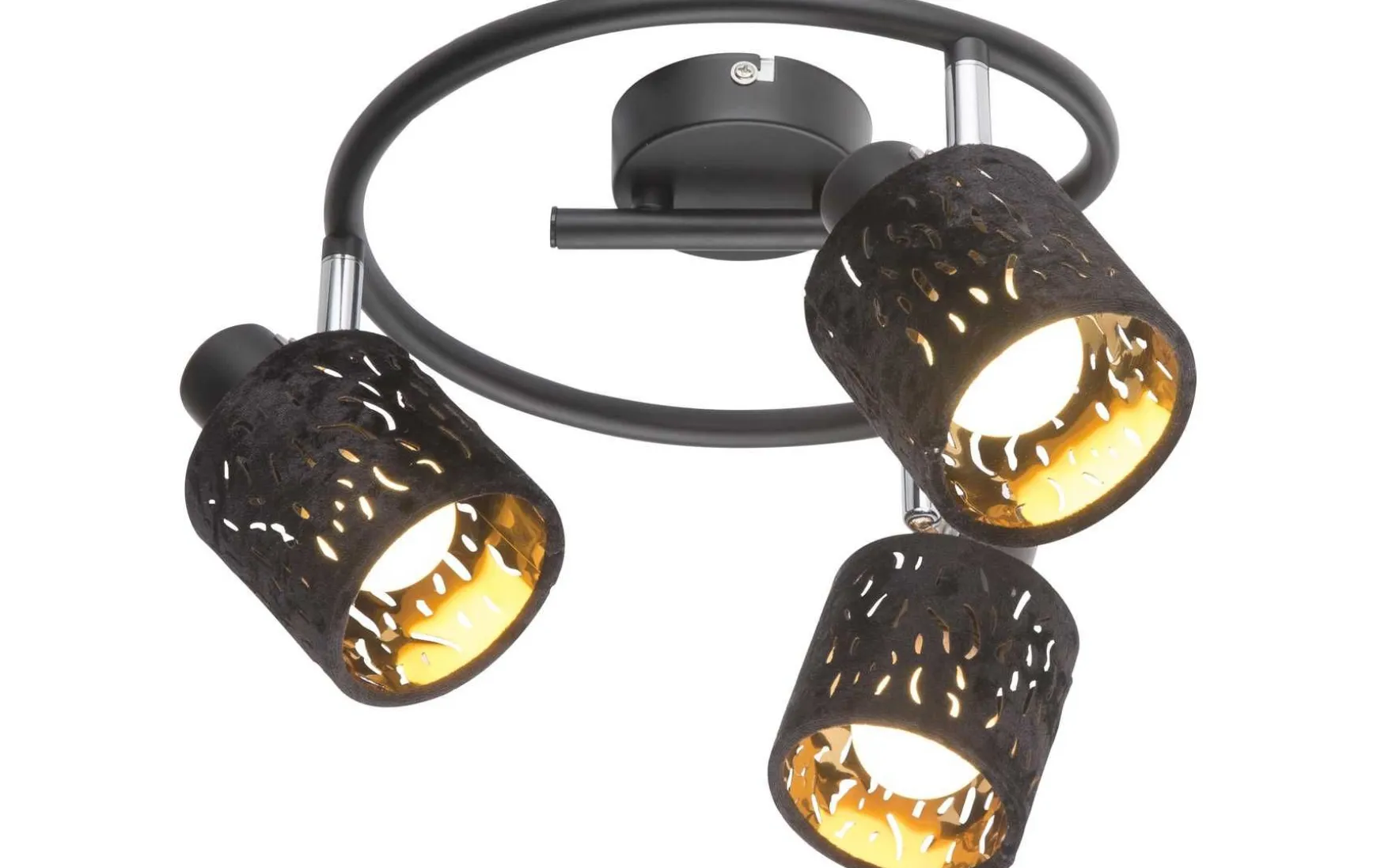Die drei beweglichen und an e-förmigen Arm befestigten gestanzten zylinderförmigen Schirme dieses Strahlers sind mit schwarzem Samt überzogen, was wunderbar zur goldfärbigen Innenseite der Spots passt, die damit für ein wunderschönes Licht sorgen.