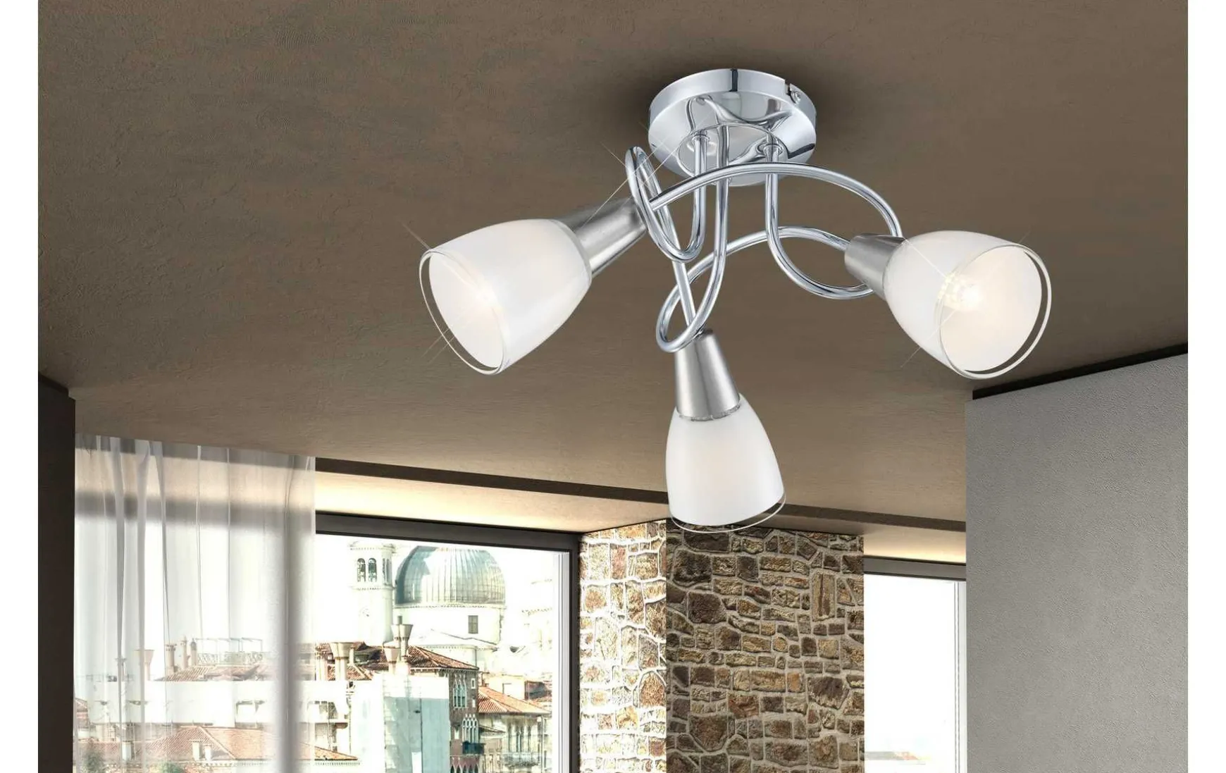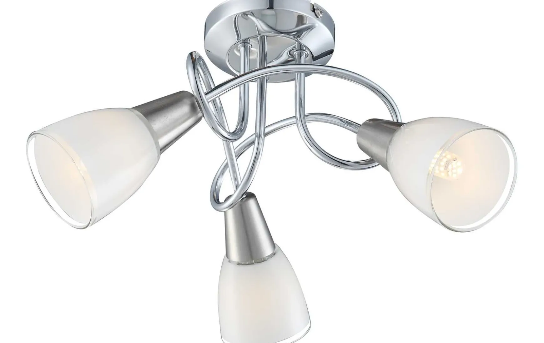Die Basis bildet Chrom in nickel matt und die Spots an den ineinander gebogenen Armen sind aus weißem Glas.