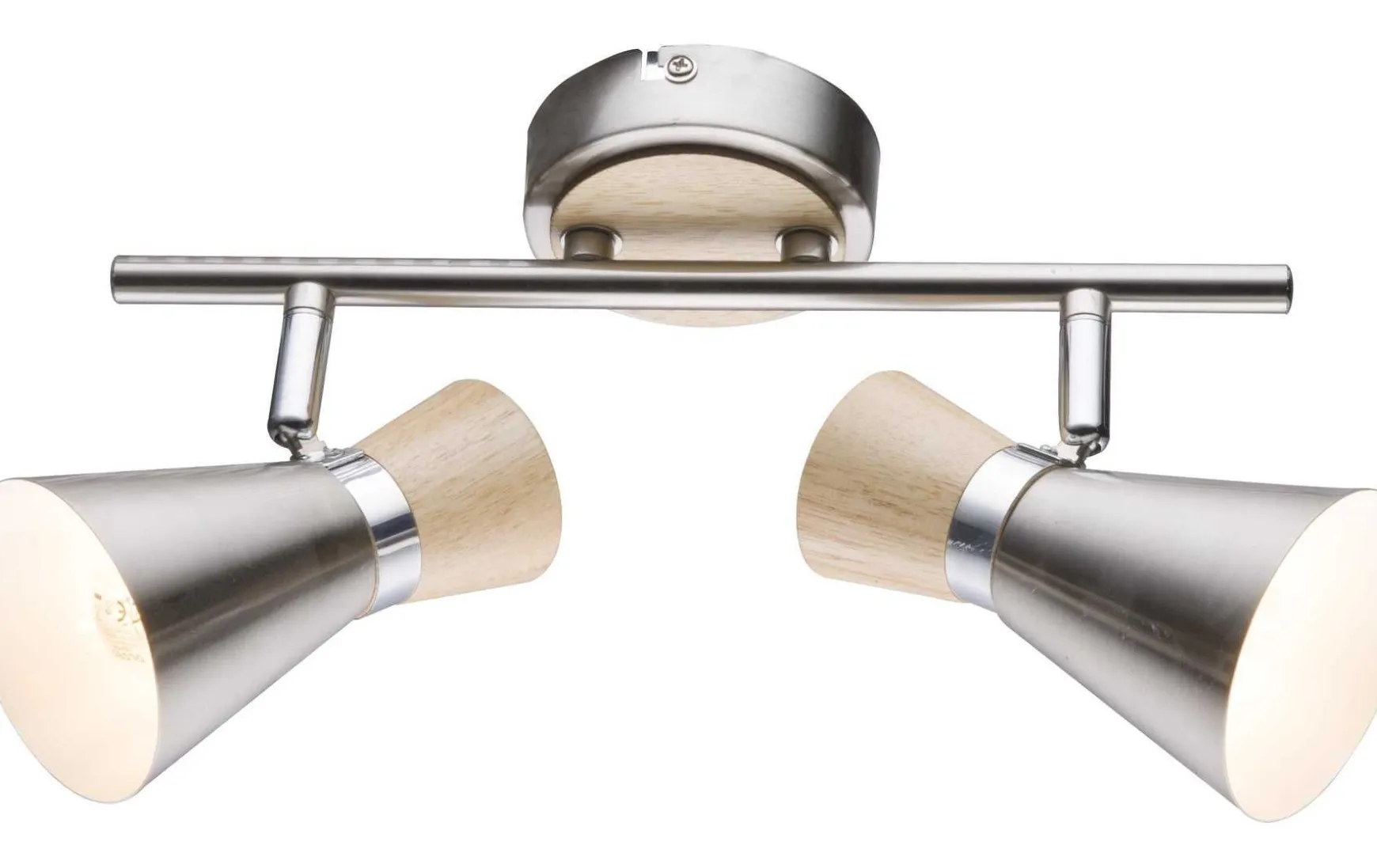 Dieser Deckenstrahler überzeugt durch die Kombination aus Design und Verarbeitung. Die Materialkombination aus Holz, nickelmatten sowie verchromten Metall sorgt für eine tolle Optik.